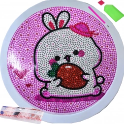 A csomag része a kerek keret kitámasztóval, amellyel a kész alkotás könnyen kihelyezhető asztalra vagy polcra. A praktikus kiegészítők – applikátor (toll), viasz és bordázott tálca – megkönnyítik a kövek pontos felvételét és elhelyezését. A motívum véletlenszerű, és nehézségi szintje gyerekekhez igazított, így az alkotás szórakoztató és stresszmentes.