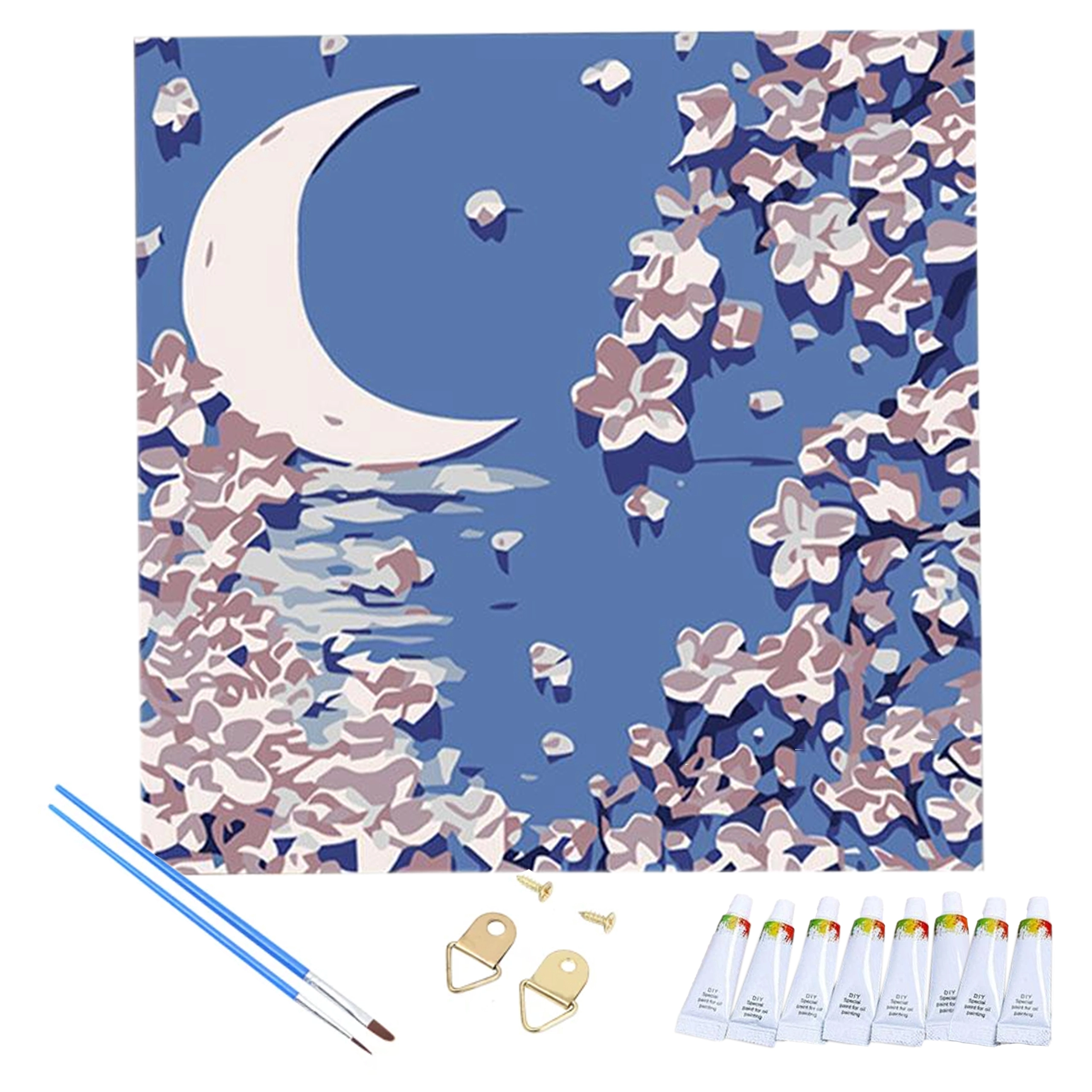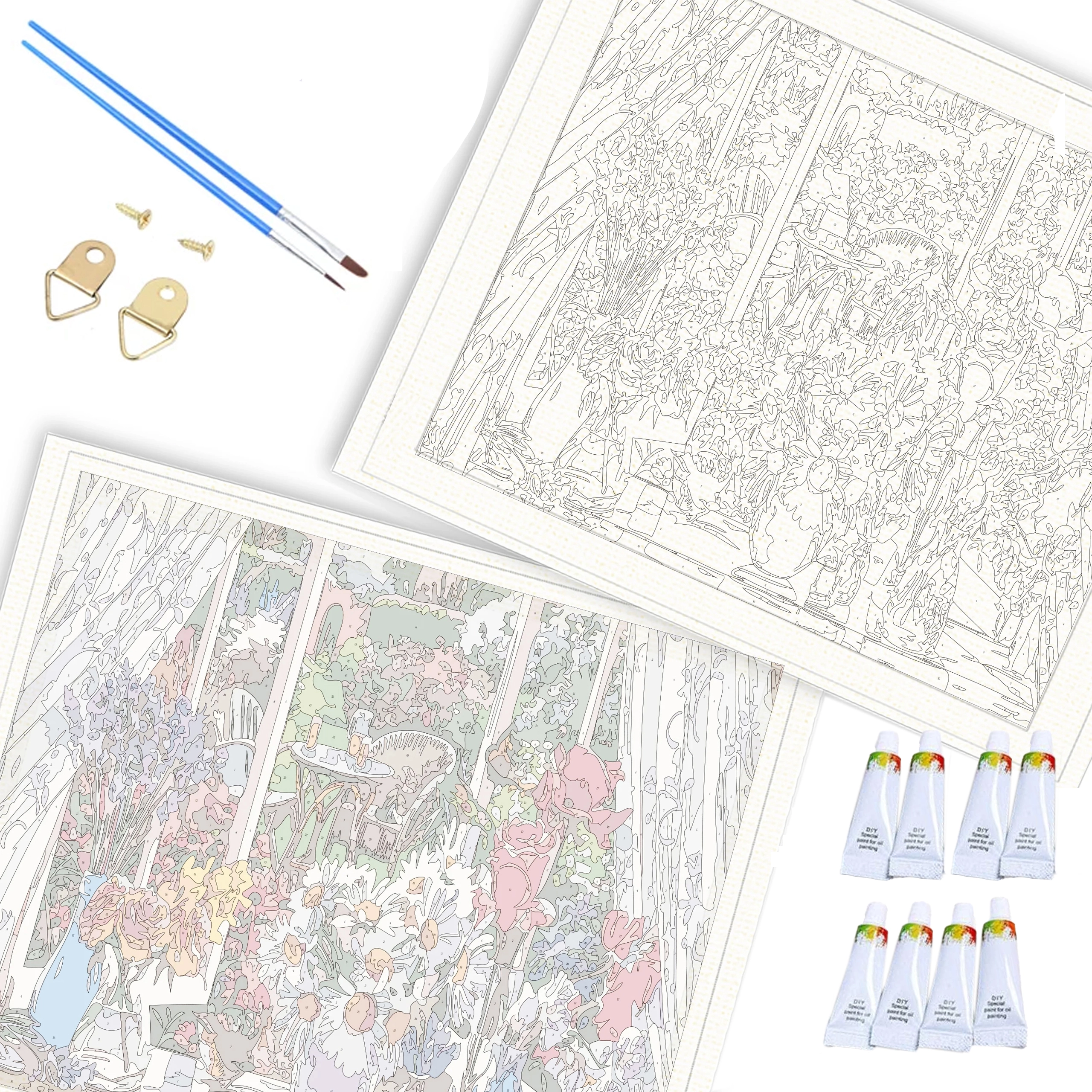 Komplett készlet számozott vászonnal, akrilfestékekkel, ecsetekkel és akasztó kiegészítőkkel. Kezdjen alkotni rögtön a kicsomagolás után.