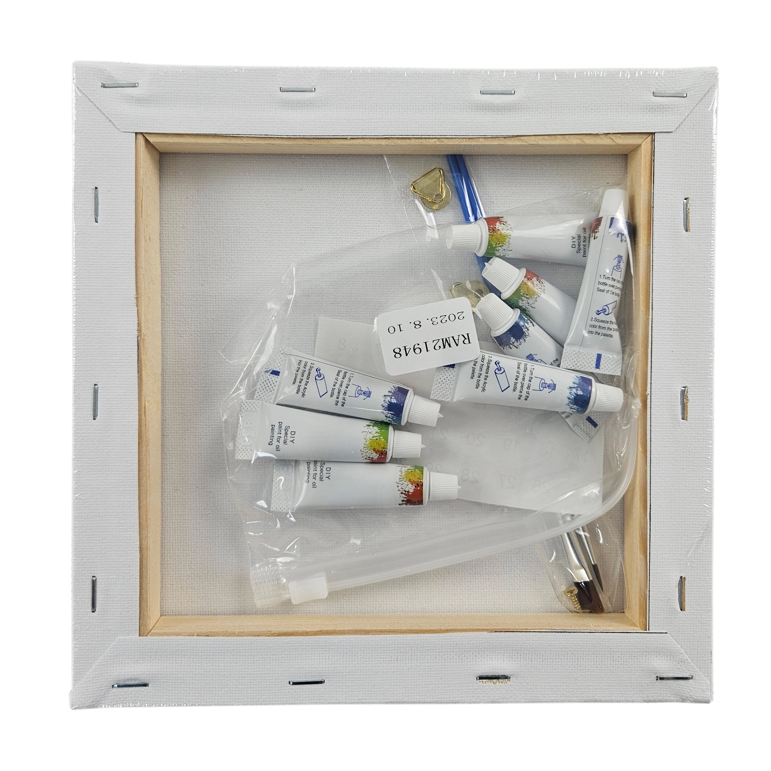 - Keretes vászon, akrilfestékek, ecsetek, függesztő kiegészítők (készlettől függően)
