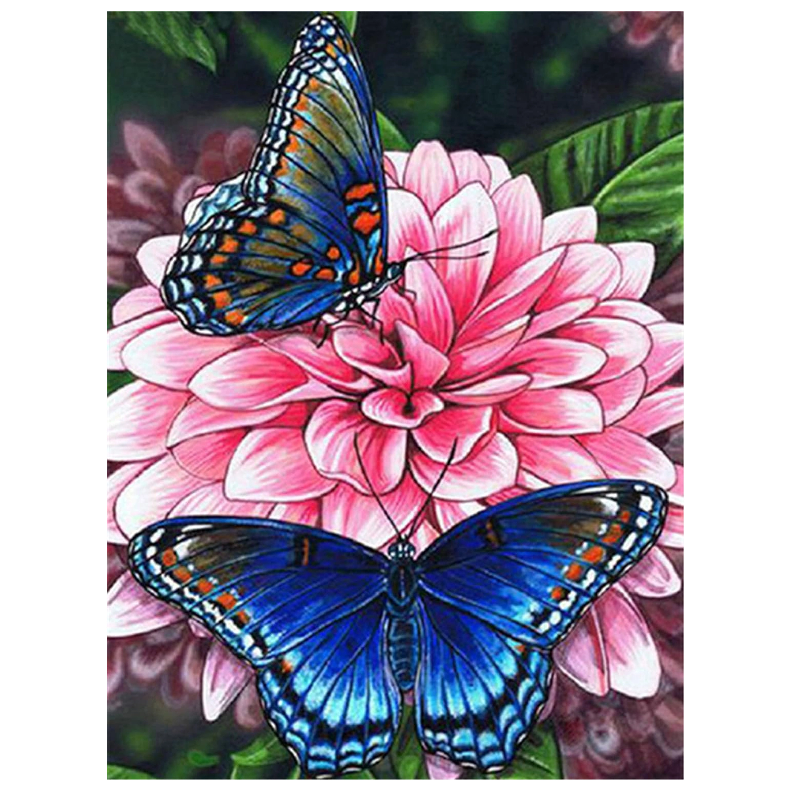 Két kék pillangó virágon látható a fa keretre feszített vásznon. A megfestés után egyszerűen felakaszthatja, és feldobhatja vele otthona hangulatát.