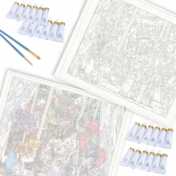 A vászon fa keretre (blindkeretre) feszített, így a kibontás után azonnal festhet, a kész képet pedig rögtön fel is akaszthatja. A csomagban teljes készletet talál – előnyomott vásznat, több árnyalatú akrilfestéket, ecseteket és kiegészítőket a falra akasztáshoz.