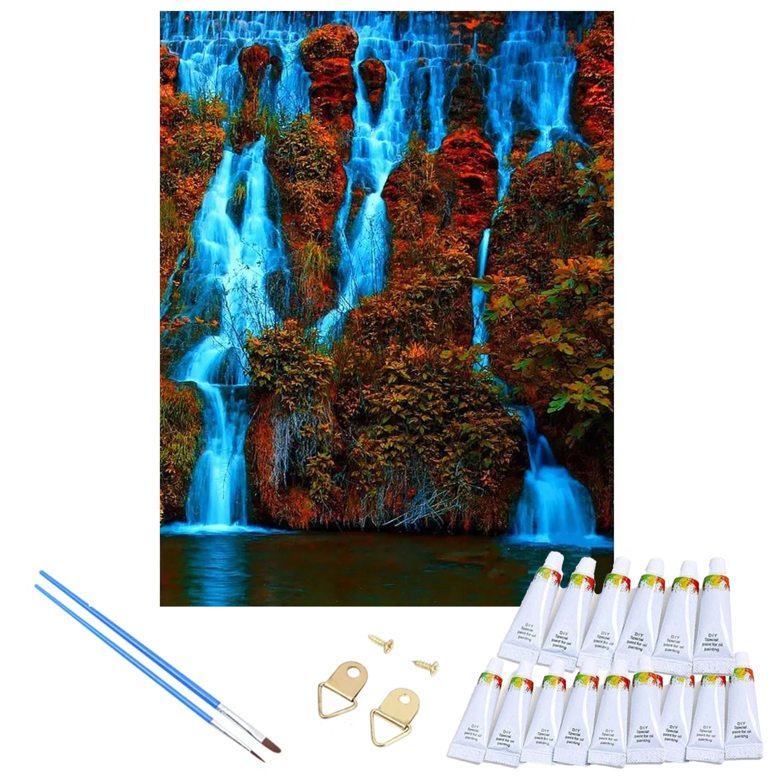 A csomagban előnyomott vásznat, akrilfestékeket és ecseteket talál – mindent, amire szüksége van a 40 × 50 cm-es vízesés megfestéséhez.