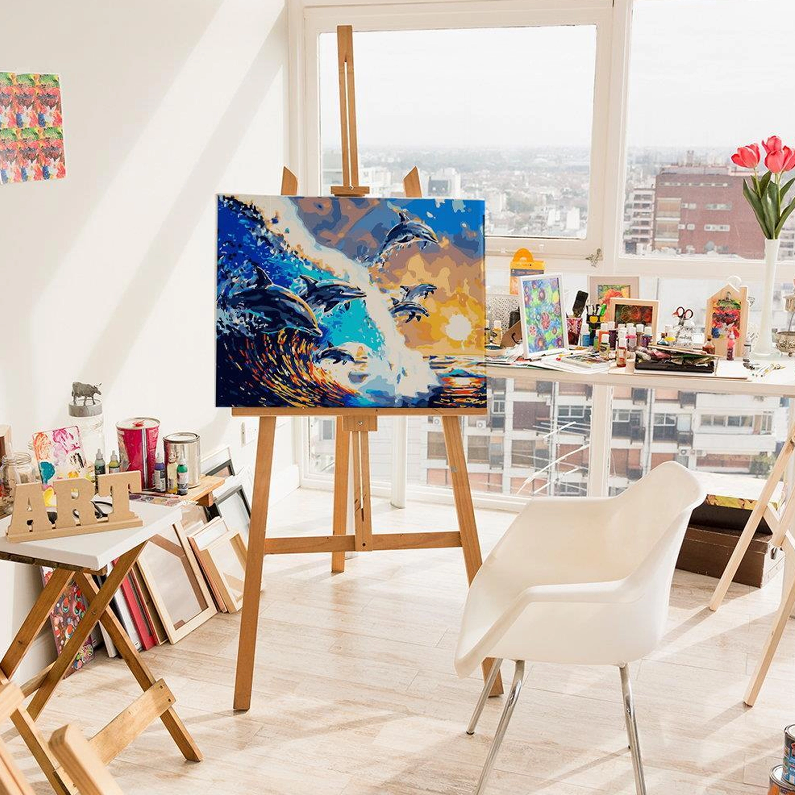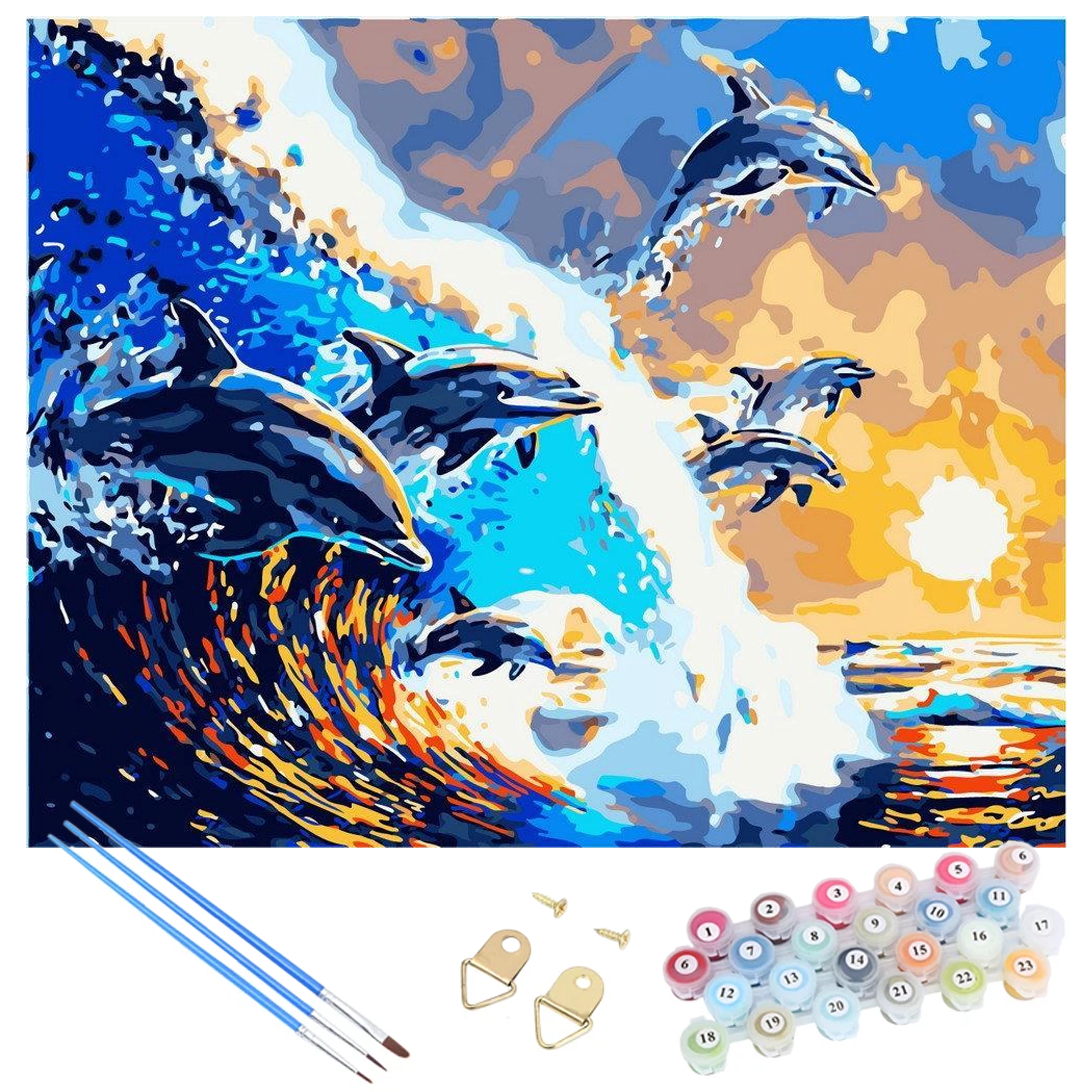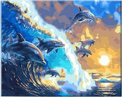 Ez a kreatív szett lehetővé teszi, hogy előzetes tapasztalat nélkül fessen saját képet. A vászon előnyomott, számozott szektorokra osztva, a csomagban pedig megfelelő akrilfestékeket és ecseteket talál. Minden szám egy adott színhez tartozik – ön csak kitölti, és figyeli, ahogy megszületik a életteli tengeri jelenet delfinekkel.
