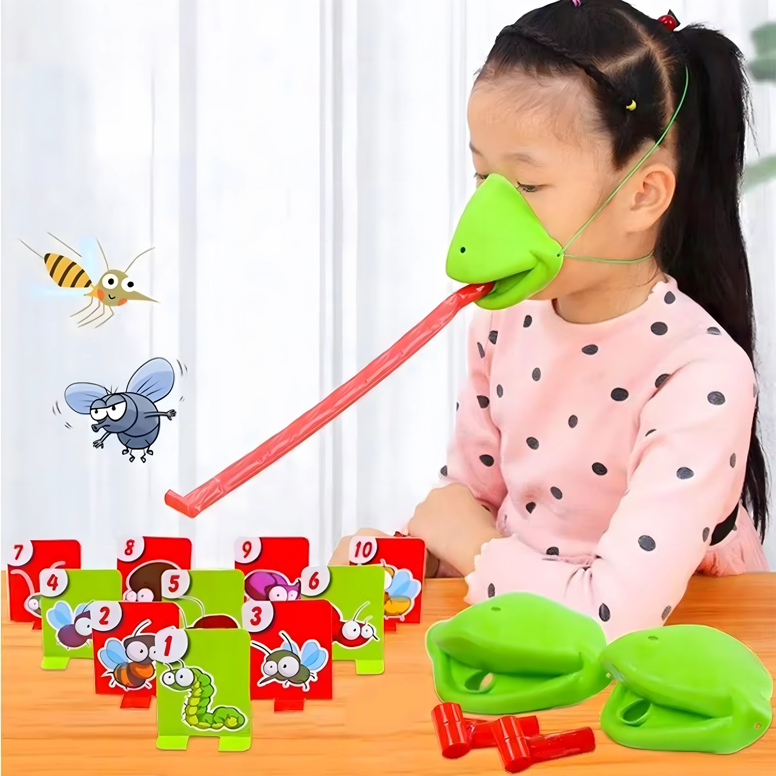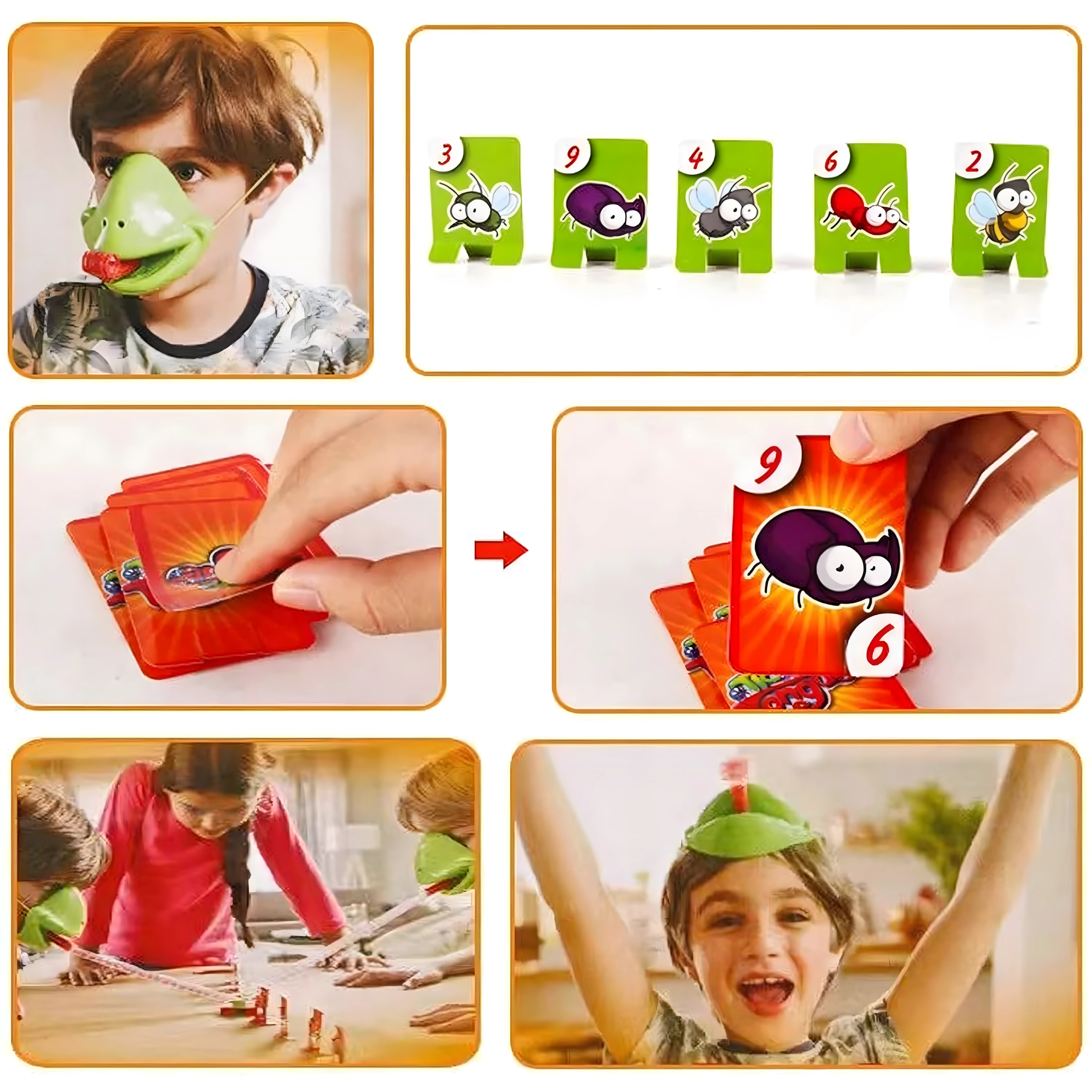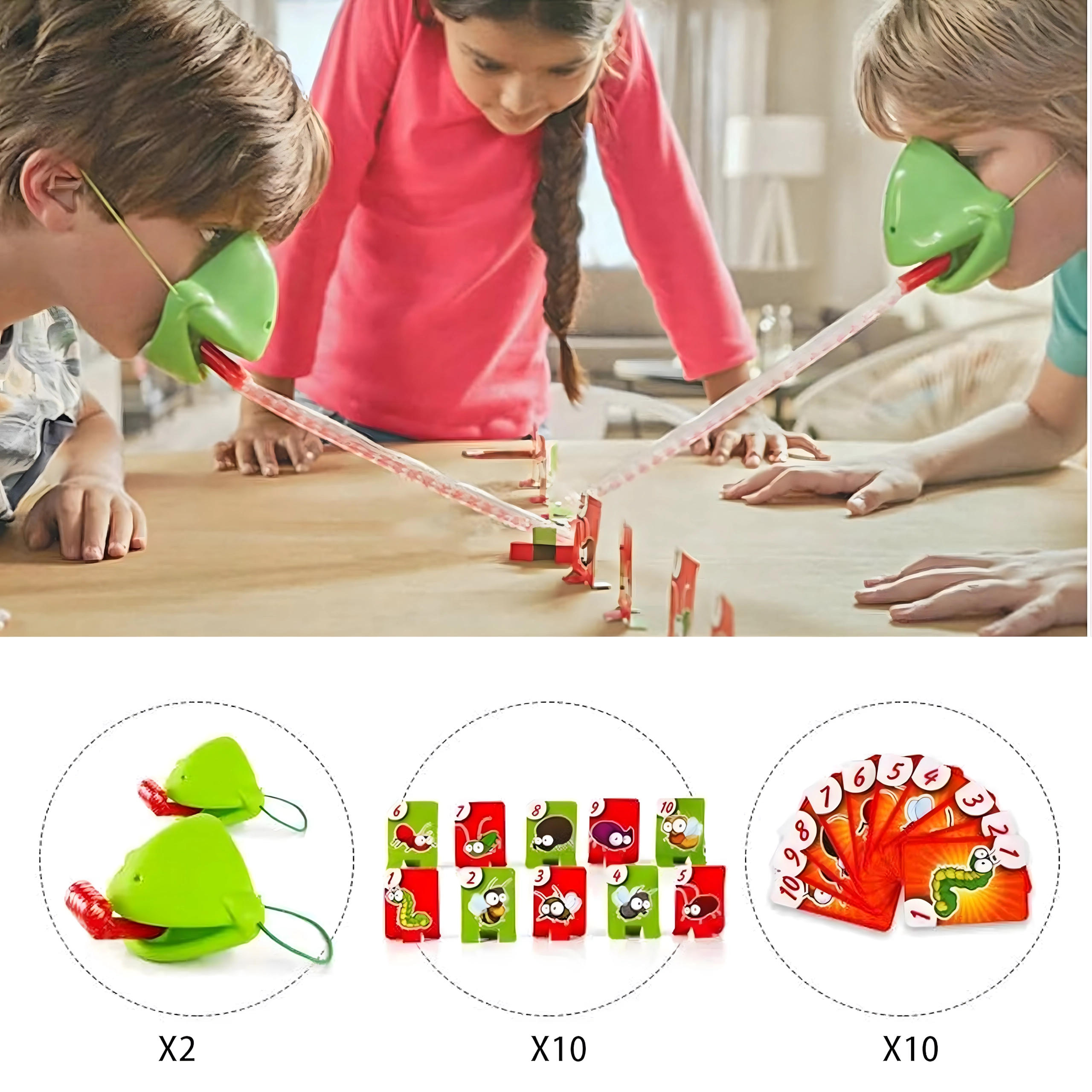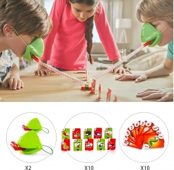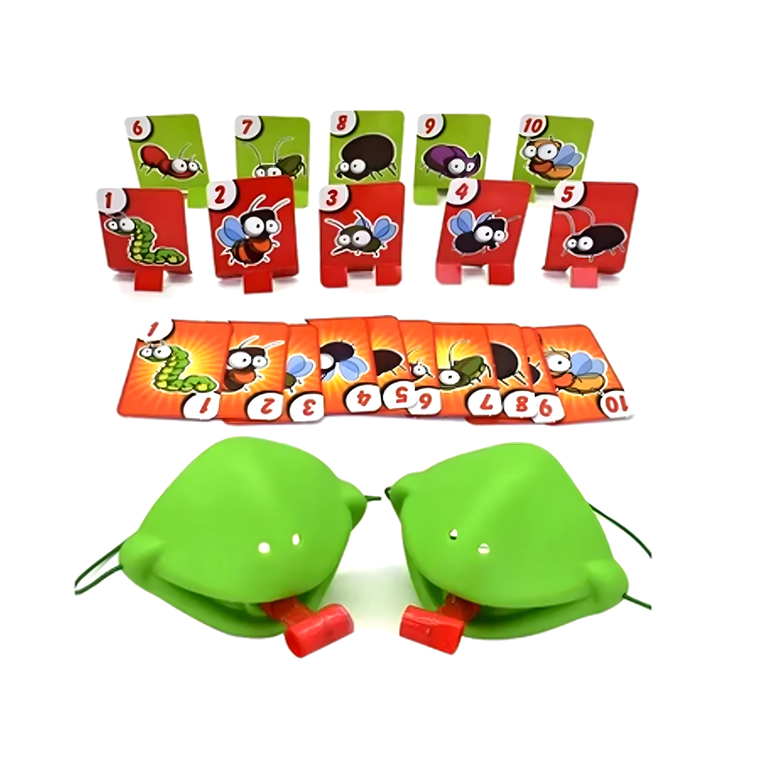 Válj békává, és indulj bogárvadászatra! Felveszed a maszkot, célzol, és a nyelvvel a célkártyákra lősz – aki a megfelelő képet vagy számot a leggyorsabban elkapja, pontot szerez. A játék könnyen érthető, pillanatok alatt előkészíthető, és kicsiket-nagyokat egyaránt lelkesít.