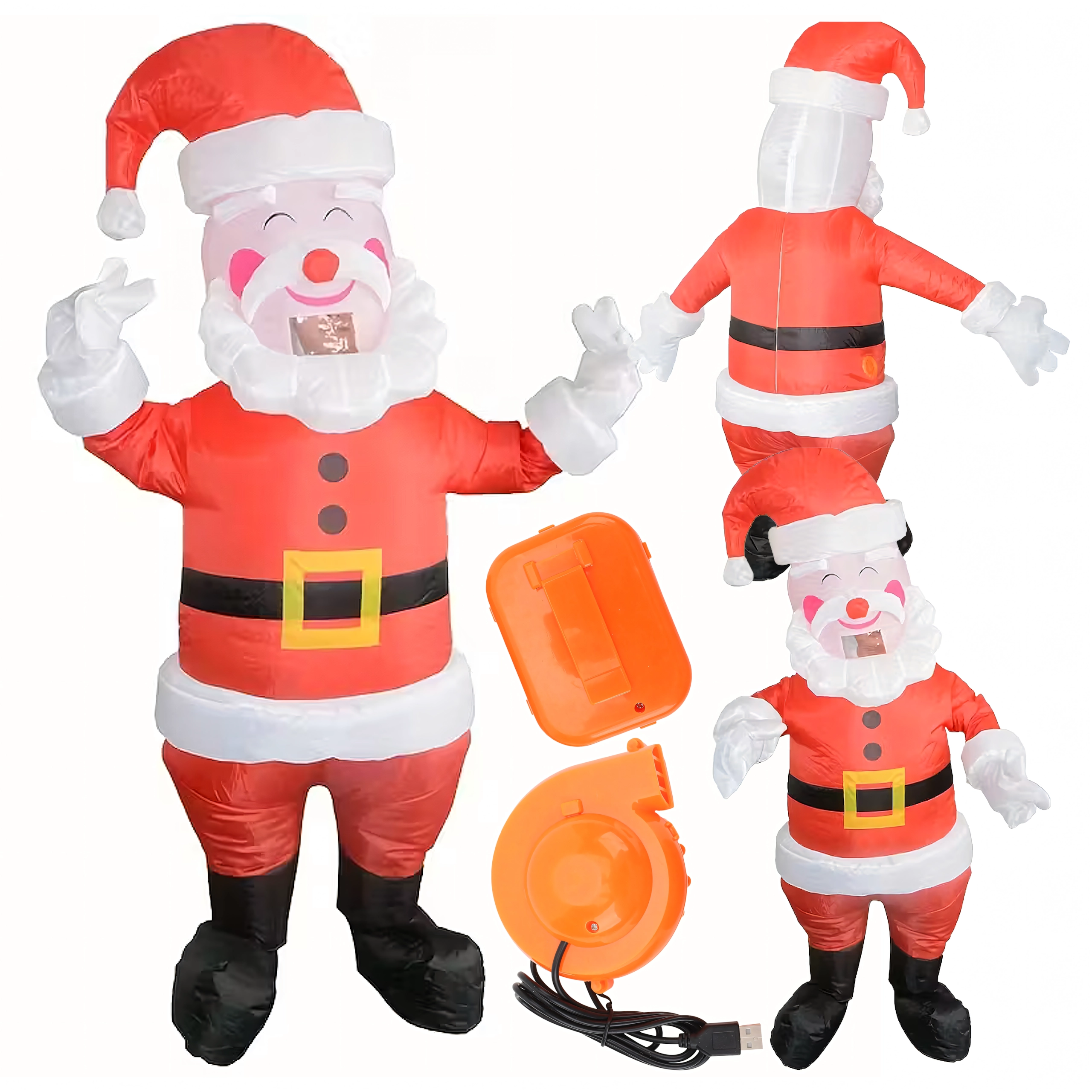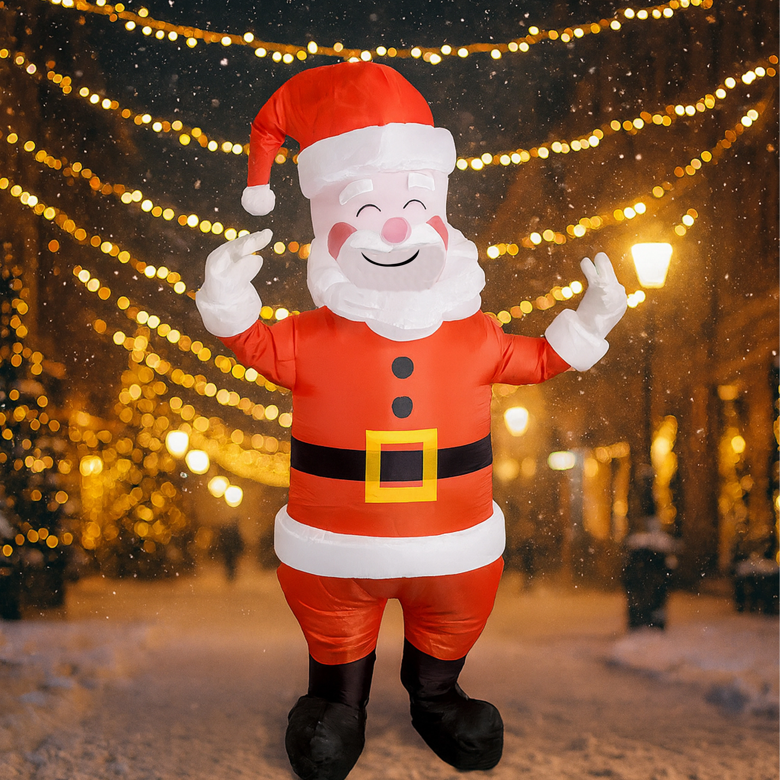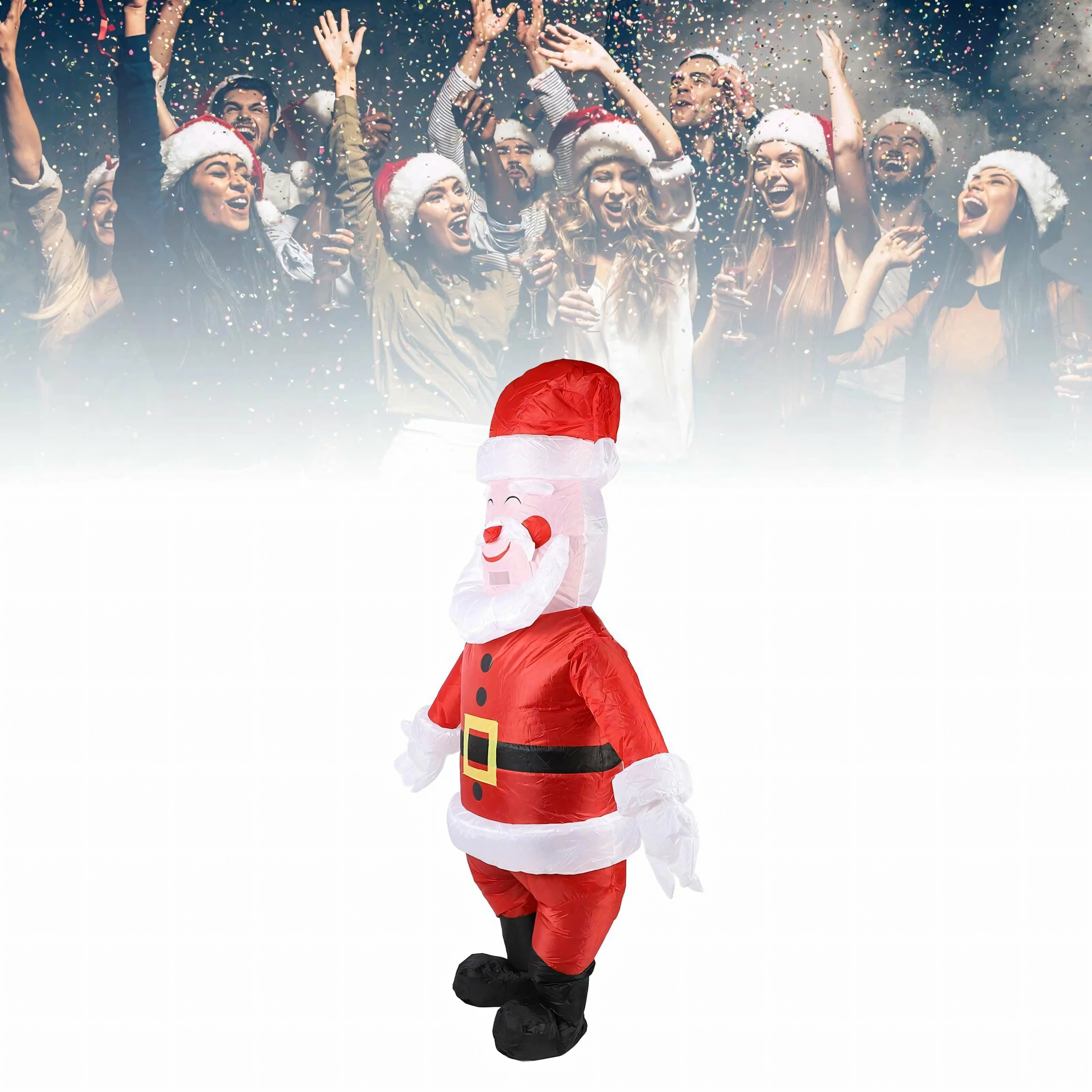 Szórakoztató és könnyen használható felfújható Mikulás jelmez felnőtteknek (kb. 150–190 cm magasságig), ideális karácsonyi bulikra, rendezvényekre és otthoni szórakozáshoz. A könnyű és kényelmes anyag a mellékelt turbina segítségével gyorsan megtelik levegővel, így pillanatok alatt felejthetetlen ünnepi hangulatot teremthetsz.