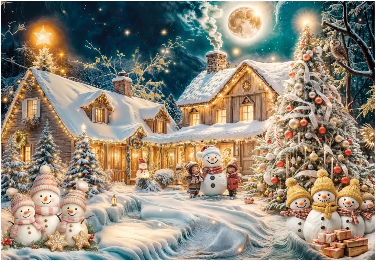 A kész kép praktikus 48 × 33 cm méretű, így a legtöbb asztalra és keretbe is illik. A minőségi nyomtatás élénk színeket és éles részleteket garantál, amelyek kiemelik a téli hangulat minden elemét.