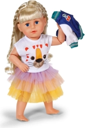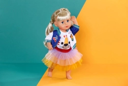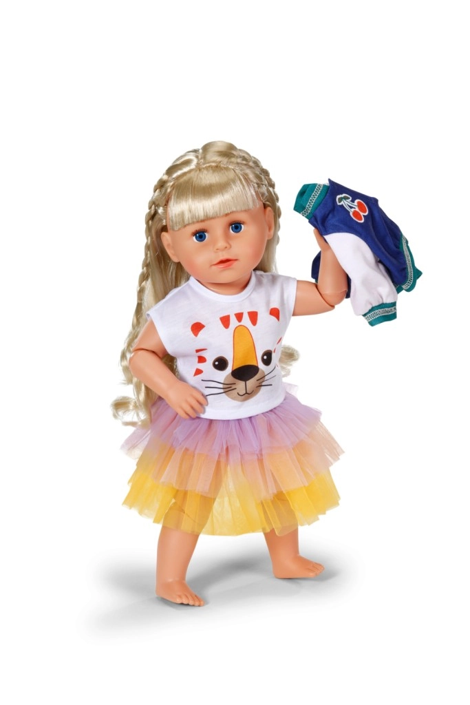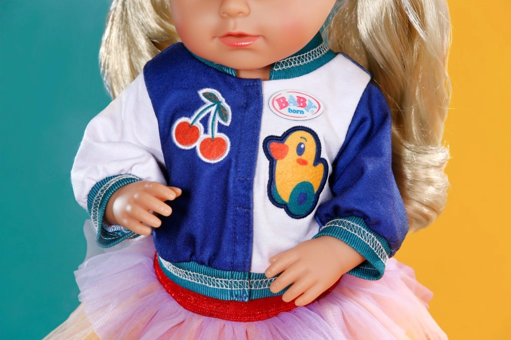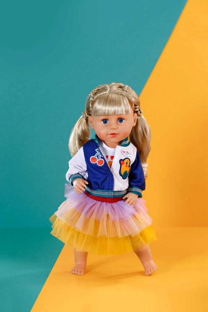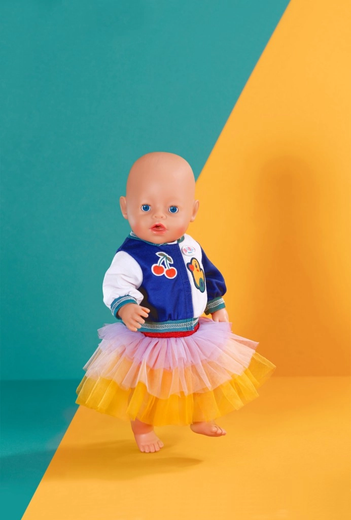 A BABY BORN babákhoz készült stílusos szett minden naphoz színes akcentust ad. Tartalmaz egy tigrisarcos pólót, egy két tónusú dzsekit és egy tüllszoknyát sárga, narancs és lila színekben. Alkalmas 43 cm-es babákhoz és a BABY BORN Teddy macihoz is. A csomag része egy újrahasznosított anyagból készült vállfa, valamint minőségi kivitel a hosszan tartó játékhoz.