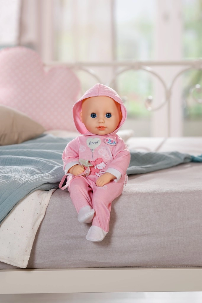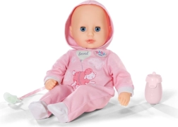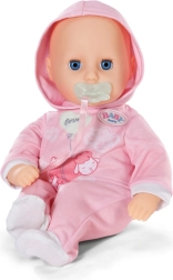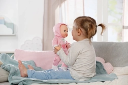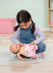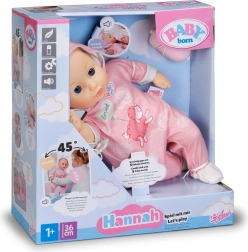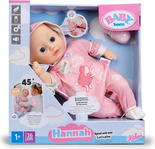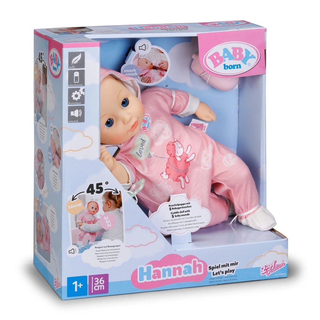 A bájos BABY born Hannah 36 cm-es baba ideális mindennapi játékra és ölelgetésre. Puha textiltesttel, élethű babahangokkal rendelkezik, tud inni a cumisüvegből iváshangokkal, becsukja a szemét, és altatáskor lágy, megnyugtató hangokat ad ki. A csomag része a cumi és a cumisüveg.