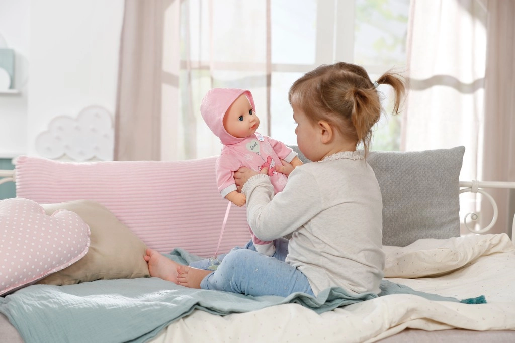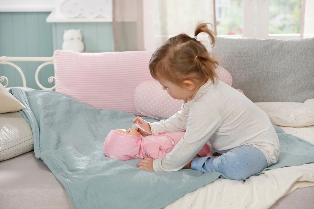 A baba támogatja az empátia, a finommotorika és a fantázia fejlődését. Tökéletes a babagondozós szerepjátékhoz – etetés, megnyugtatás és altatás cumival. Minden intuitív és biztonságos a kis kezek számára.
