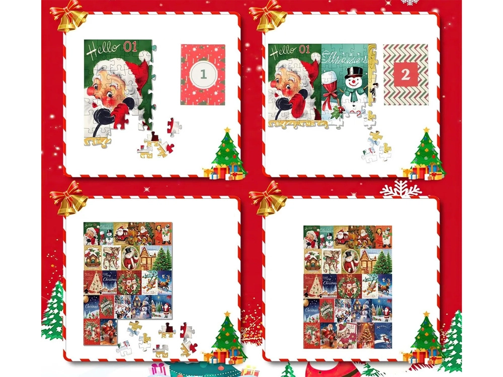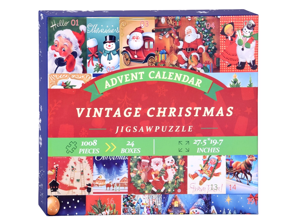Ez az adventi naptár egyesíti a karácsonyig tartó visszaszámlálás örömét a kirakózás nyugtató élményével. Minden nap kinyit egyet a 24 ablak közül, és egy kis, egyedi vintage motívumú kirakót kap. Az összes kirakó befejezése után egyetlen 70 × 50 cm-es közös kép áll össze, amely szépen kiegészíti az ünnepi dekorációt.