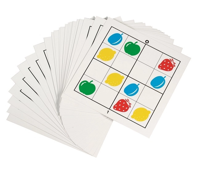 Ez az okos, legkisebbeknek szánt sudoku-változat egyszerű szabályokat és rengeteg szórakozást kínál. A gyerekek a 4×4-es rács üres mezőit töltik ki úgy, hogy azonos képek ne ismétlődjenek sem sorban, sem oszlopban, sem a négyzetekben – akárcsak a klasszikus sudokuban, csak vidám gyümölcsös képekkel.