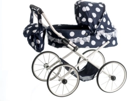 Stílusos, retro kialakítású babakocsi, amely örömet szerez minden kis anyukának. Fekete, pöttyös, elegáns csipkével díszített kivitelben, állítható, 55 cm-es tolókarral a kényelmes irányításhoz és lehajtható kupolával az egyszerű kezelhetőségért. Tartozik hozzá táska a tolókarra és praktikus alsó kosár az apróságoknak.