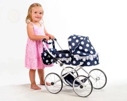 Ez a bájos, retro babakocsi remek választás azoknak a gyerekeknek, akik szeretnek családosat játszani. A fekete alapszín fehér pöttyökkel és díszes csipkével stílusos, időtálló megjelenést kölcsönöz, a rattan bölcső pedig varázslatos hatást ad a kocsinak. A állítható tolókar (55 cm) révén jól igazodik a gyermek magasságához.