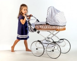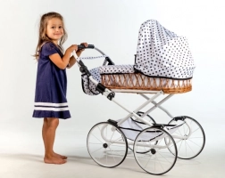 Stílusos gyermek babakocsi retro dizájnnal, fonott vesszőből készült mózeskosárral és fehér, pöttyös vázzal, amely minden kis anyukának örömet szerez. Lehajtható napellenző, állítható tolókar (76 cm), válltáska a tolókarra és alsó kosár biztosítják a kényelmes és szórakoztató játékot. 3 éves kortól ajánlott.