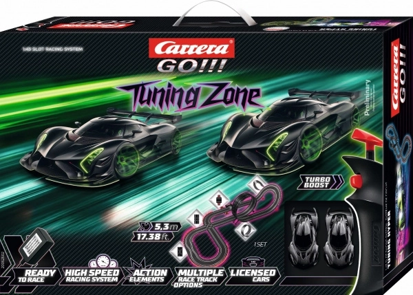 A CARRERA GO Tuning Zone autópálya otthoni versenyzéshez hoz adrenalinban gazdag élményt. Az 5,3 méteres pályán változatos elemek várnak: hurok, függőleges fal, kereszteződés, pályaszűkítés, gyors egyenesek és technikás kanyarok. Két, részletgazdagon kidolgozott hipersportautó áll rajthoz 1:43 méretarányban, a Turbo funkciós vezérlők pedig a sebességet a maximumra emelik.