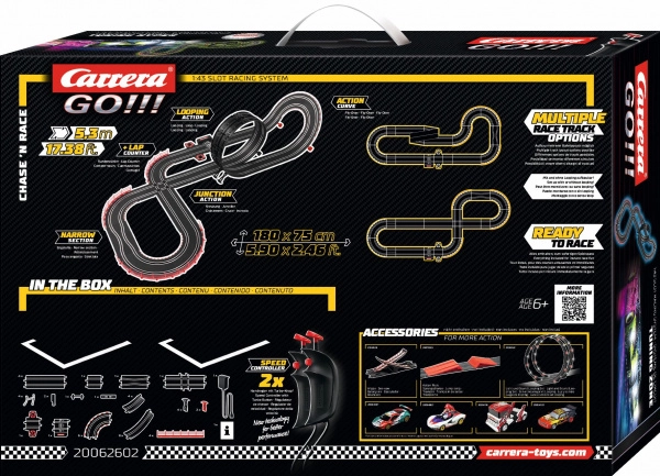 A stabilitást és a sima futást a dupla érintkezőkefék és a mágnes biztosítja minden autóban. A pálya a praktikus csiptetős rendszerrel és a magasságállítható tartókkal könnyen összeállítható. A mechanikus körszámláló áttekinthetővé teszi a futamot, a korlátok és a vezetősínek pedig növelik a biztonságot. A készlet kezdőknek és haladóknak egyaránt ideális, és kompatibilis a CARRERA GO széles tartozékkínálatával.