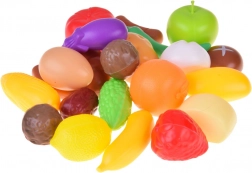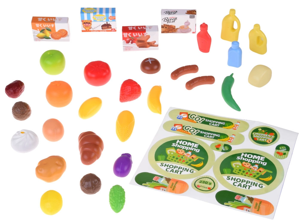 A csomag gyümölcsöket, zöldségeket, pékárut, italokat, dobozokat és matricákat tartalmaz. A gyerekek így valósághűen játszhatnak vásárlást és válogathatják az élelmiszereket.