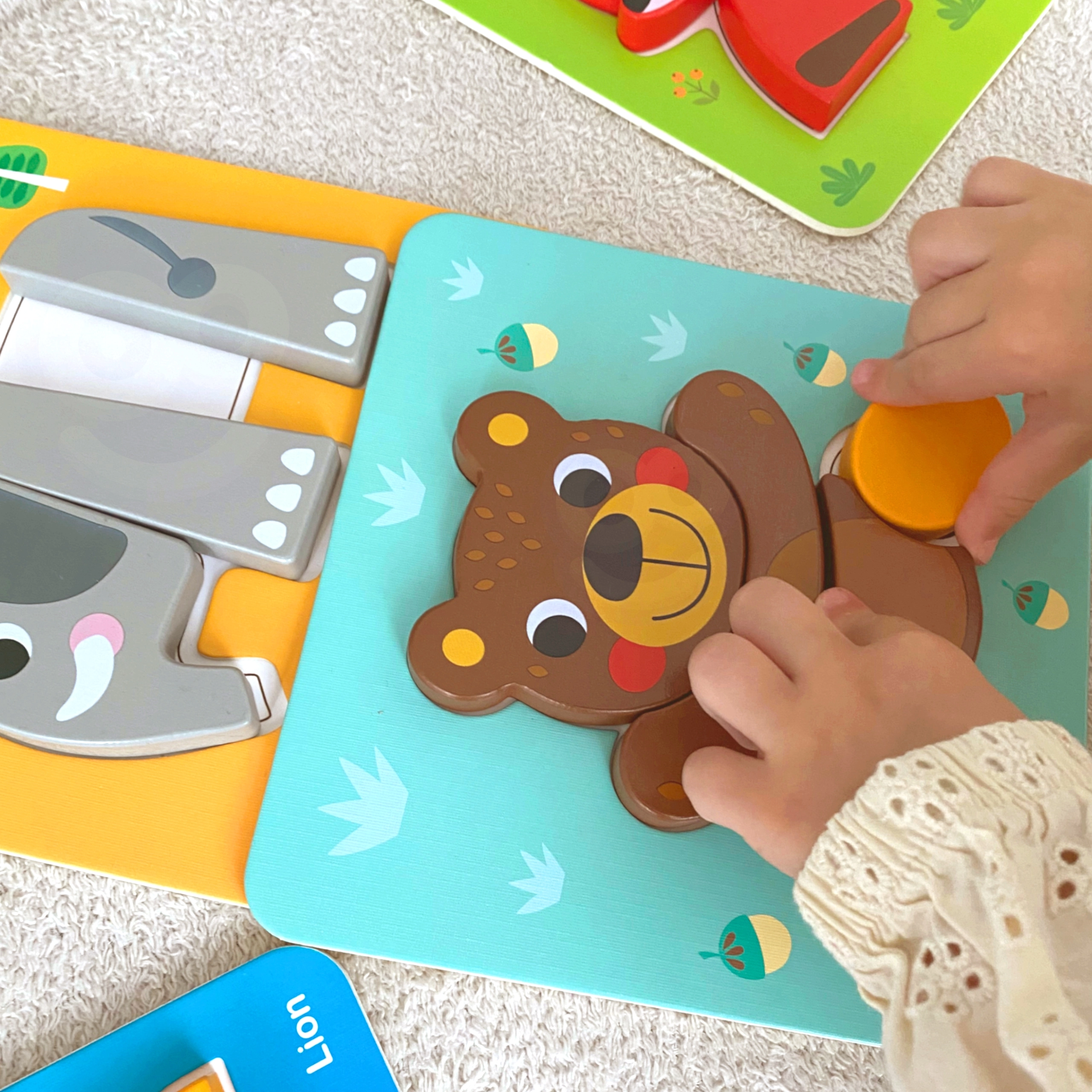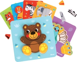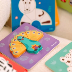 A színes állatmotívumok segítik a színek és formák felismerését, valamint a szókincs fejlődését. A gyerekek gyakorolják a szem–kéz koordinációt és a türelmet.