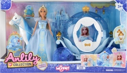 Varázslatos készlet a kis meserajongóknak, amely mindent tartalmaz a királyi szórakozáshoz: hercegnőt csillogó kék ruhában koronával, egy fenséges fehér lovat és egy nagy hintót áttetsző elemekkel, amely játék közben világít. A baba hosszú szőke haja és a részletes kiegészítők segítik a fantáziát és a történetmesélést.