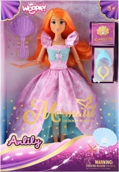 Fedezze fel a varázslatos Lily – hercegnő babát a Woopie Royal márkától, amely elbűvölő, csillogó pasztell ruhával és hosszú, rózsaszín hajjal érkezik fésüléshez és formázáshoz. A csomagban található egy kagyló alakú fésű és egy „drágaköves” gyűrű, amelyekkel a gyerekek királyi, fantáziadús történeteket alkothatnak. Remek ajándék kis hercegnőknek 3 éves kortól.