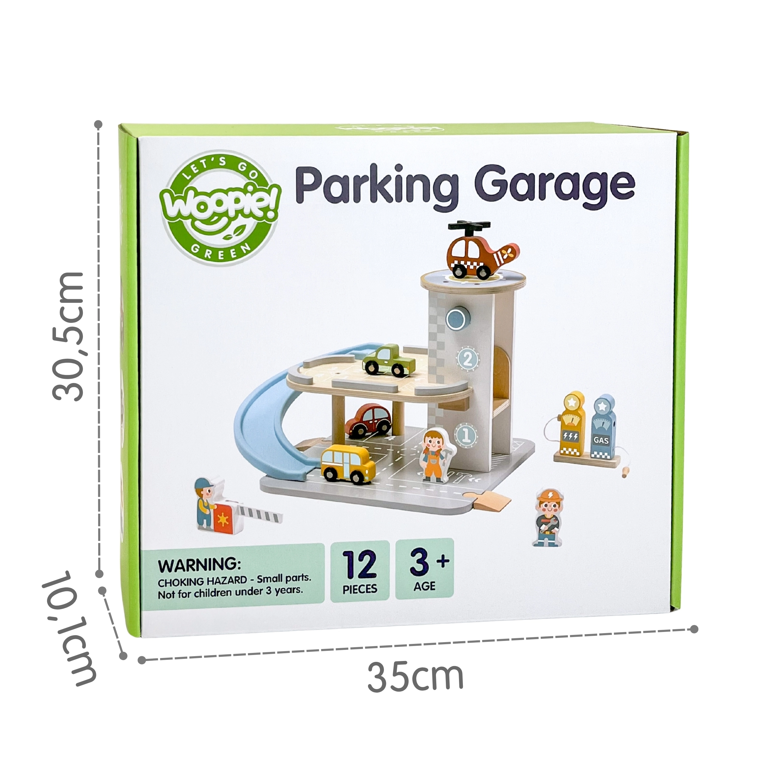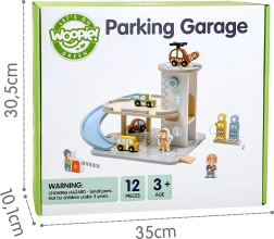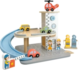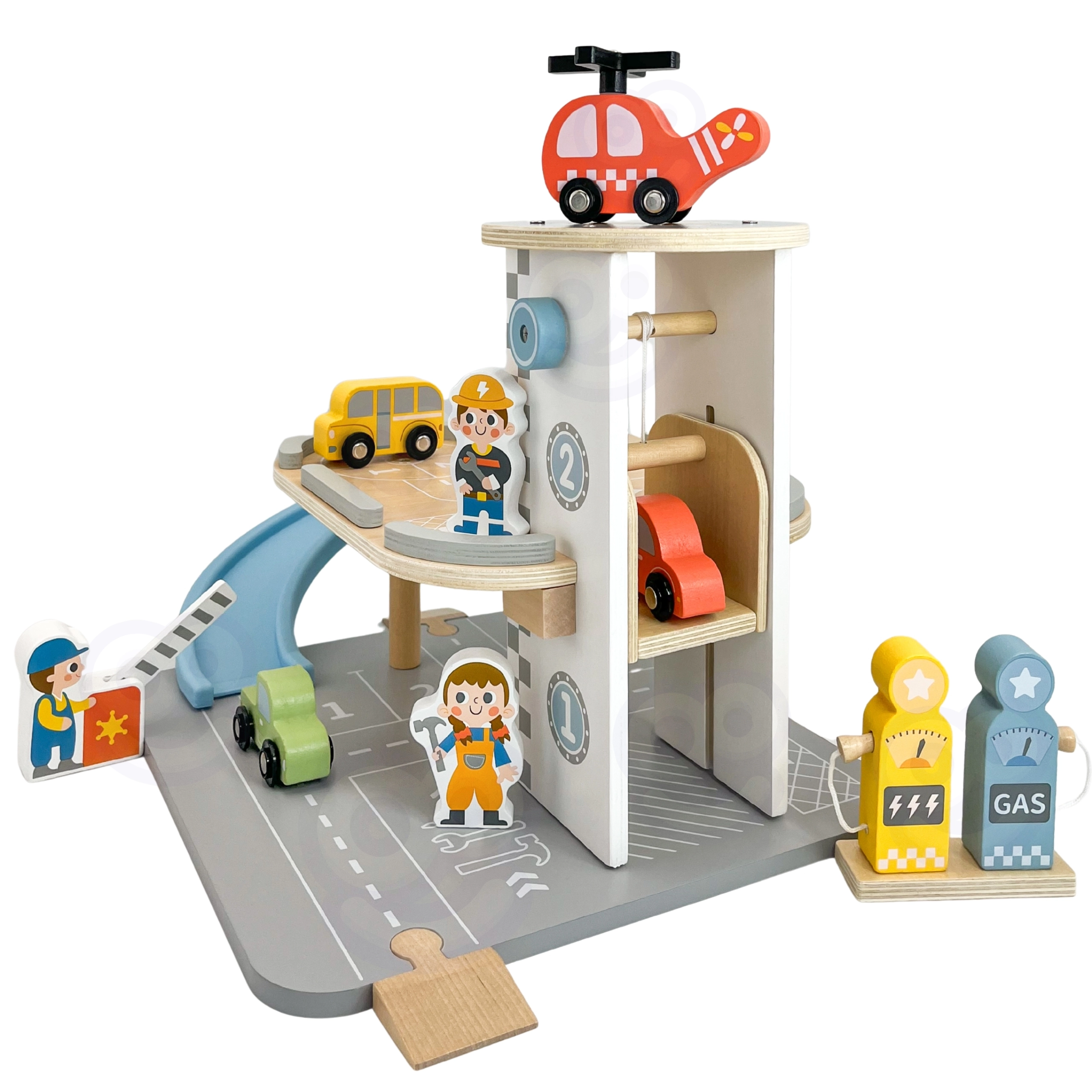 A 2 az 1-ben fa parkoló két szintes garázst és töltőállomást egyesít, hogy a gyerekek vezethessenek, parkolhassanak és tankolhassanak. A kisautók száguldanak a kék spirál rámpán, a forgó rotorral ellátott helikopter a tetőn lévő heliporton száll le, a személyzet figurái pedig gondoskodnak az üzemelésről. A minőségi fa megmunkálás és a stabil alap biztonságos játékot garantál 3 éves kortól.