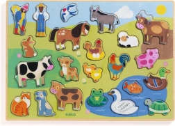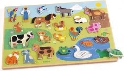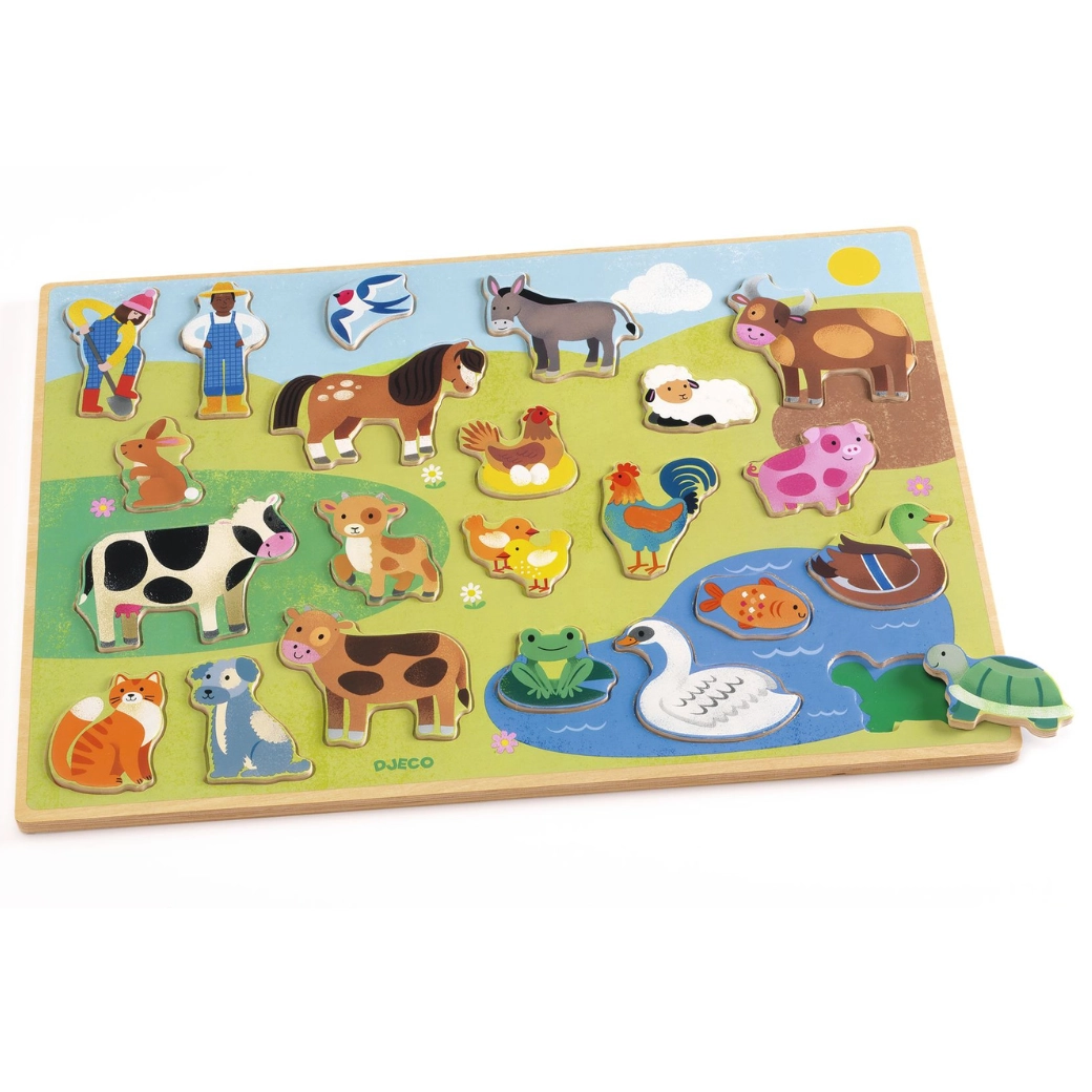 Fedezd fel az állatokkal teli, varázslatos farmot a DJECO fából készült bedugós kirakójával. Ideális a finommotorika, a logikus gondolkodás és az állatismeret fejlesztéséhez a legkisebbeknél.
