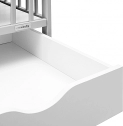 A golyóscsapágyas síneken futó MDF fiók nem ér a padlóhoz, így könnyen kihúzható és tiszta marad. A három magasságban állítható rács (22 / 38 / 51 cm a padlótól) alkalmazkodik az újszülötthöz és a totyogóhoz is, a három kivehető pálca pedig biztonságos, önálló be- és kijárást tesz lehetővé anélkül, hogy az egész oldallécet le kellene engedni.