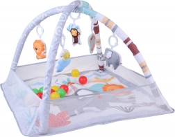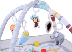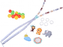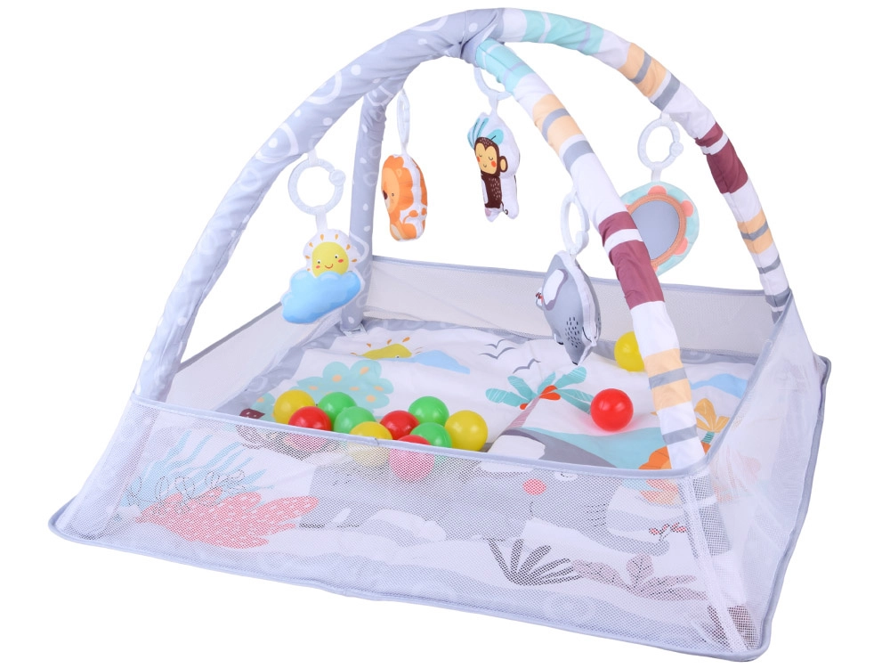 A plüss állatkák, a napocska felhővel, a babatükör és a színes labdák fejlesztik a látást, tapintást és hallást, valamint ösztönzik a nyújtózkodást, megfogást és a forgást.