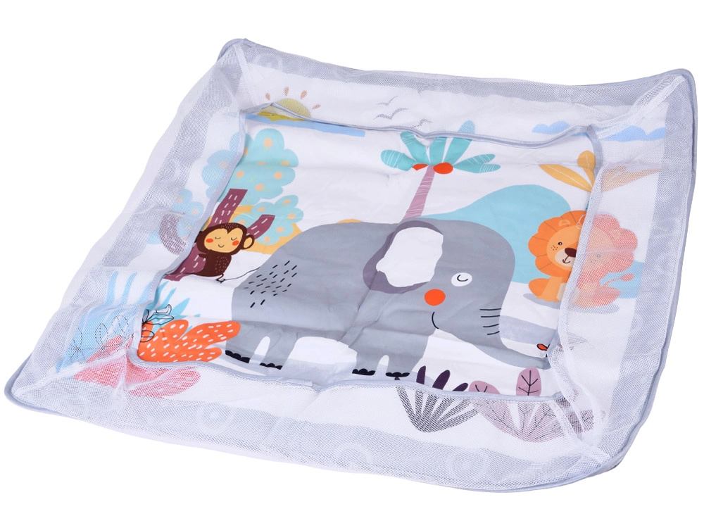 Ez az oktató szőnyeg puha párnázással és vidám állatkákkal biztonságos sarkot teremt a világ felfedezéséhez már az első napoktól. Két keresztezett, könnyen levehető ív hordozza a függeszthető játékokat, melyek nézegetésre, megfogásra és mozgásra csábítanak. A hálós oldalfalak bent tartják a játékokat és labdákat, és növelik a biztonságérzetet.