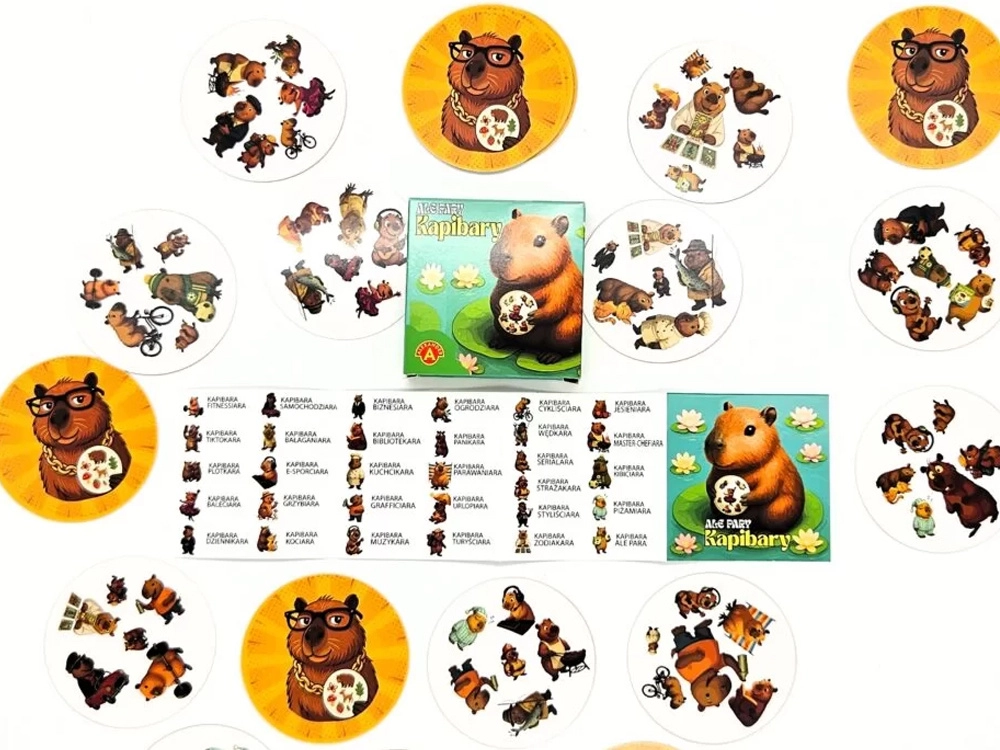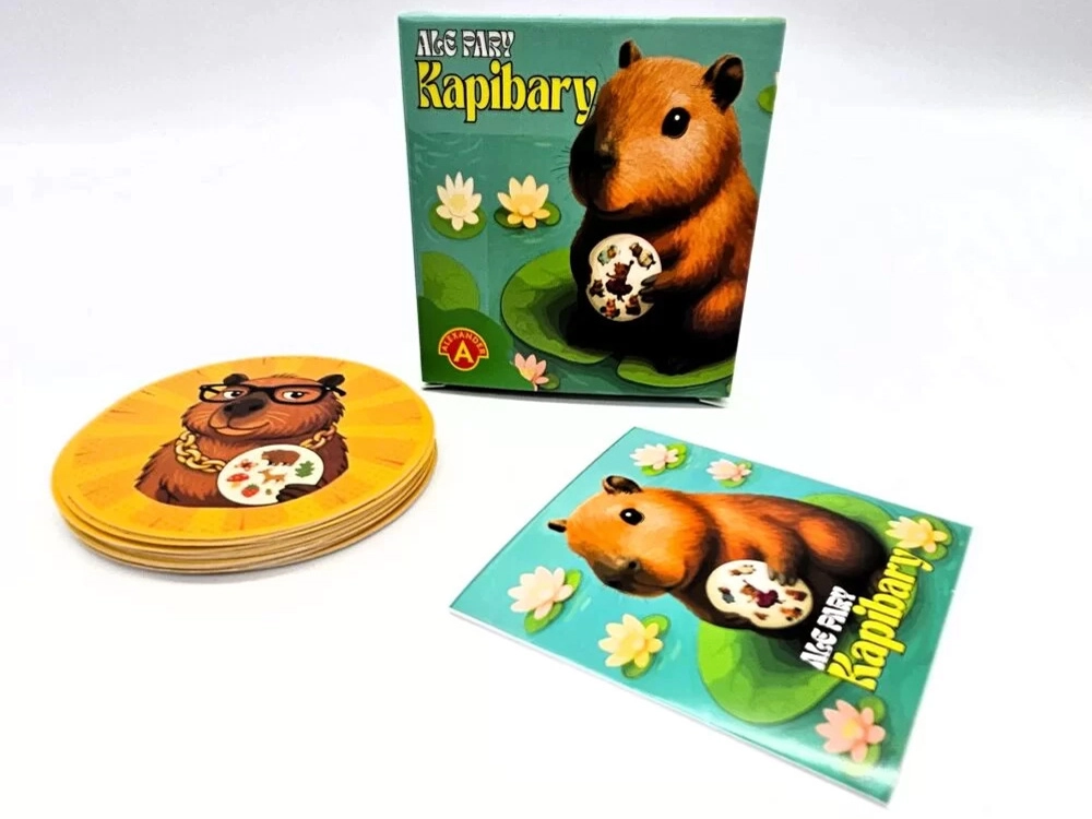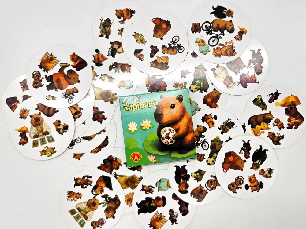 Ez a pörgős játék 31 színes, kerek kártyát tartalmaz, kapibarákkal különféle szerepekben – a balerinától és zenésztől a üzletasszonyon át a kertészig vagy sportolóig. Minden két kártyán pontosan egy közös szimbólum található, amely eltérő méretű vagy elhelyezkedésű lehet. Aki először ismeri fel, pontot szerez.