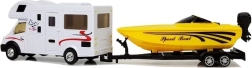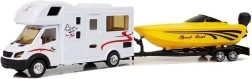 Ez a stílusos lakókocsi sárga motorcsónakkal ideális a kis sofőrök és vízkedvelők számára. A lendkerekes meghajtásnak köszönhetően elég a járművet finoman hátrahúzni és elengedni – magától előre suhan. A realisztikus részletek, mint az ülések és a kormány, serkentik a képzelőerőt és fejlesztik a történetmesélést.