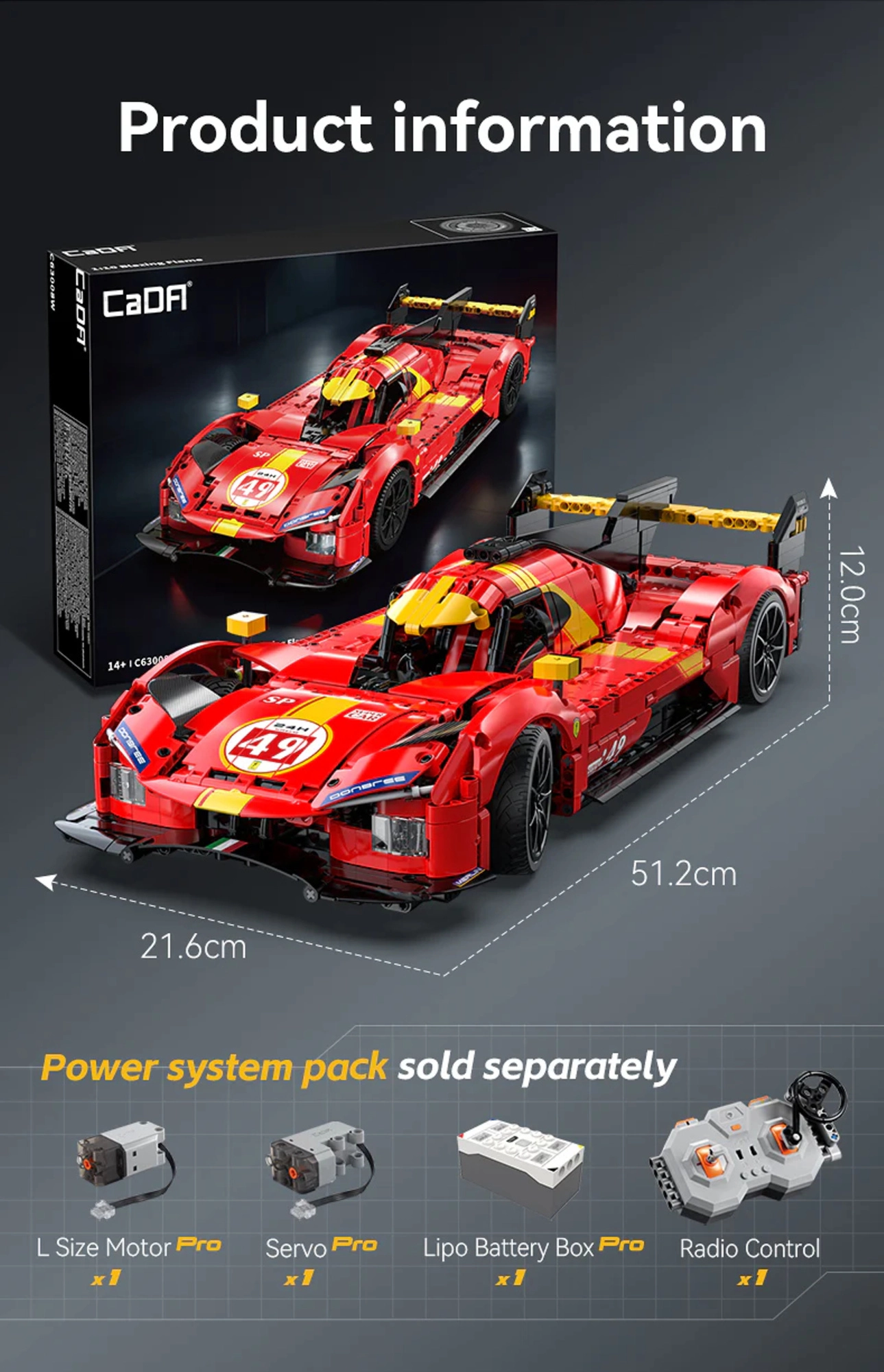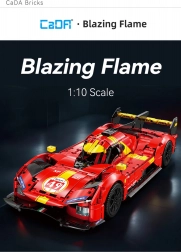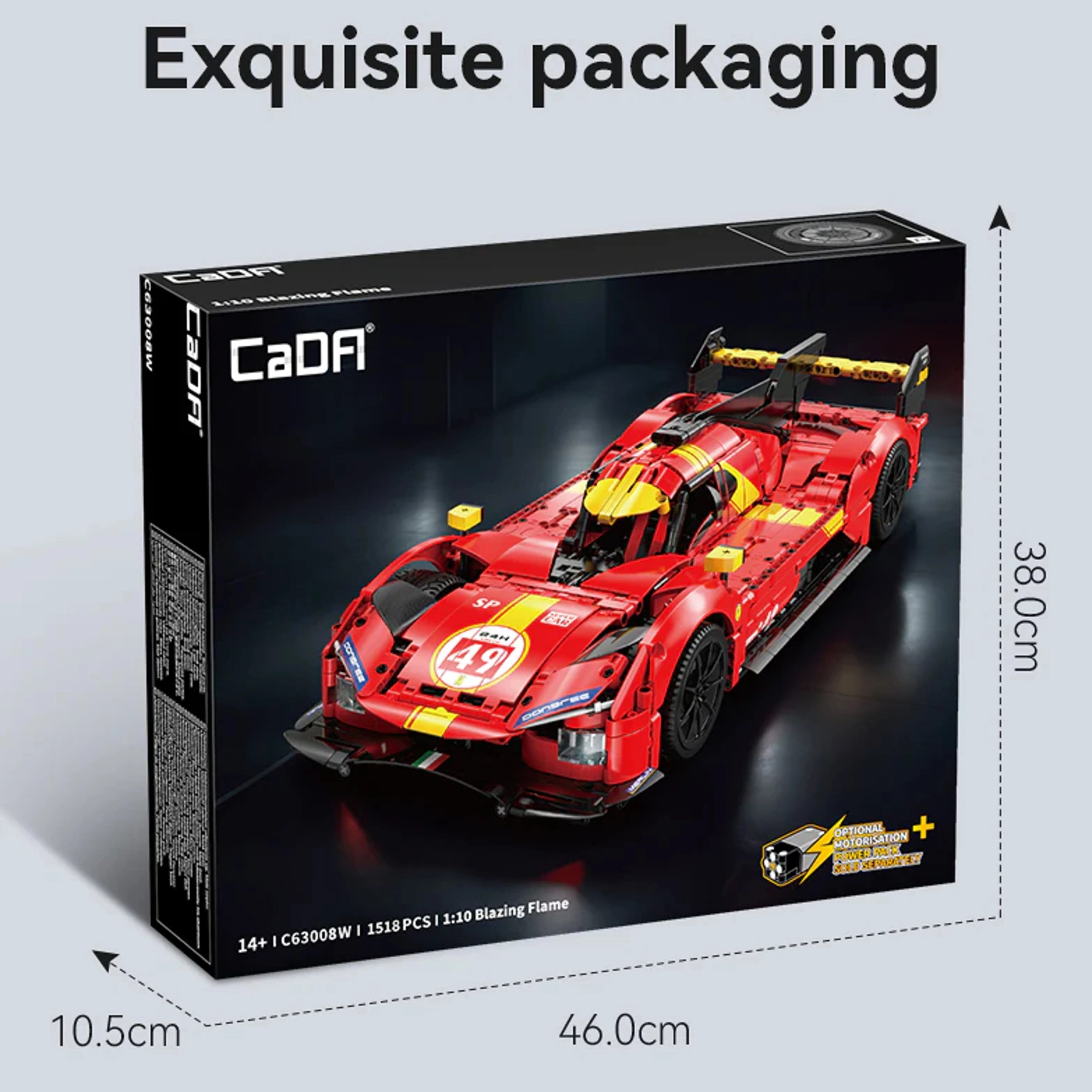 Építsd meg a lenyűgöző CaDA Blazing Flame versenyautót 1:10 méretarányban, 51 cm hosszban, 1518 elemből. A modell kiemelkedik a részletes beltérrel, a nyitható ajtókkal és motorháztetővel, a működő kormánnyal, a független felfüggesztéssel és a V6-os motor replikájával. Opcióként RC hajtás is hozzáadható (kompatibilis a Power System Pro-val – nem tartozék).