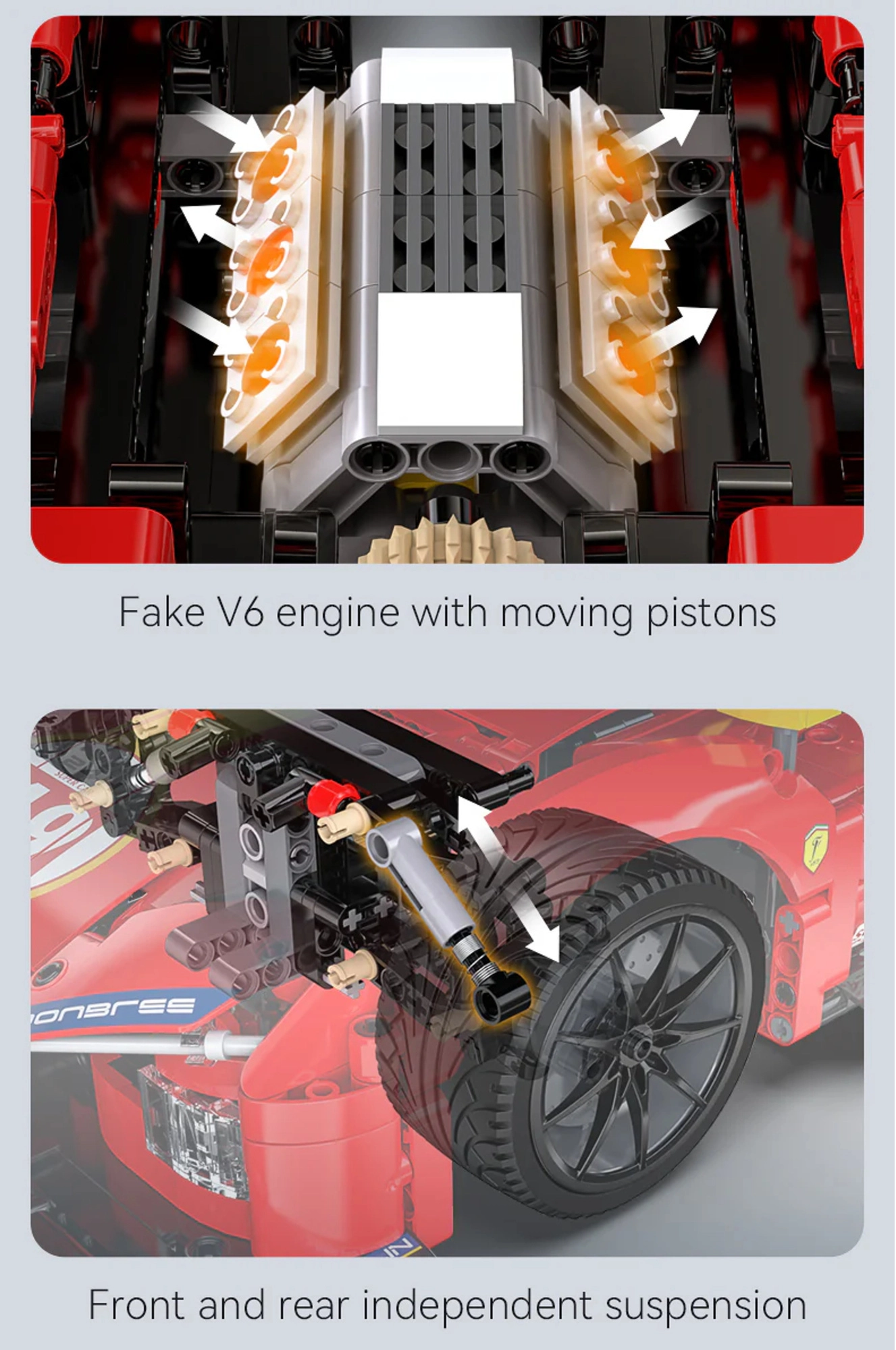 V6-os motor mozgó dugattyúkkal és távirányításra való előkészítés (az összetevők külön megvásárolhatók) emelik a modellt egy magasabb szintre.
