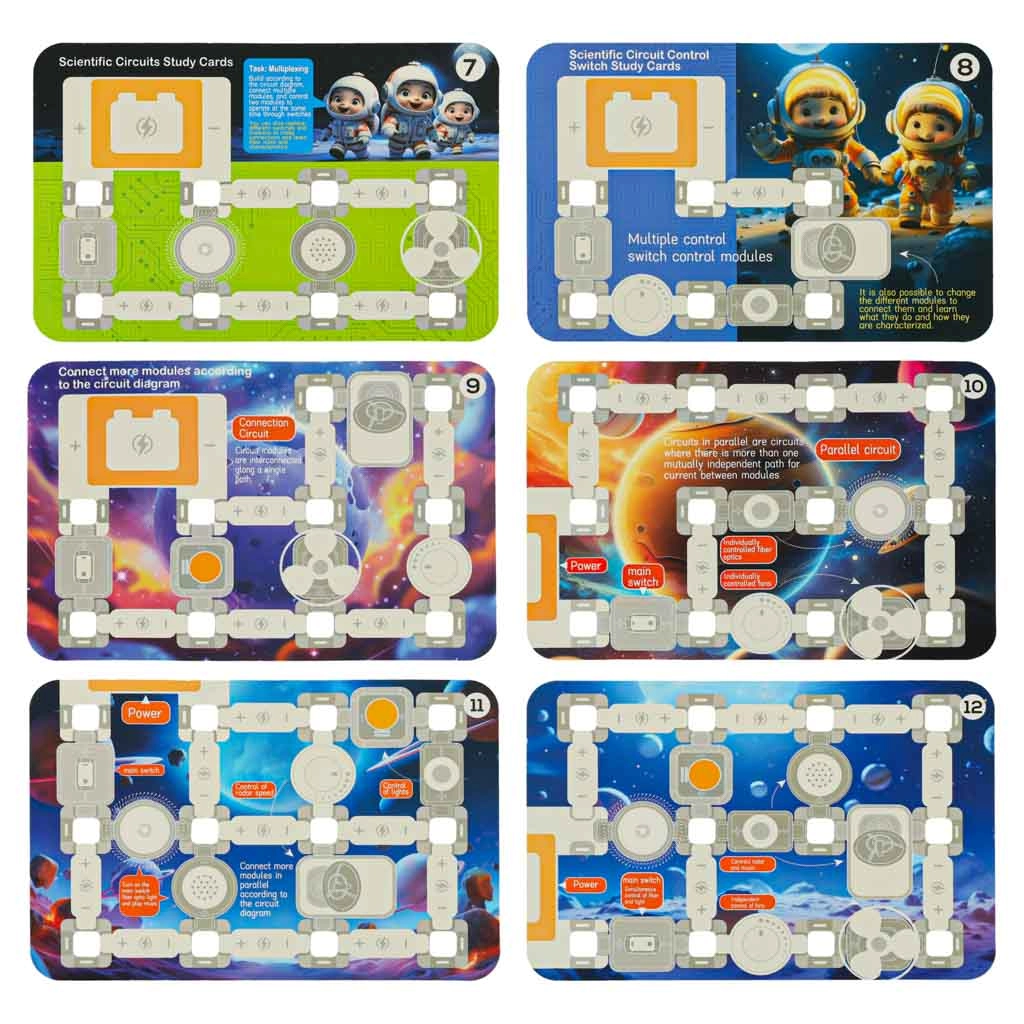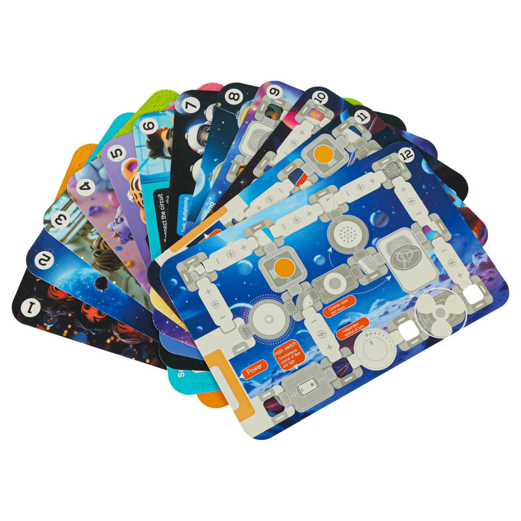 Színes kártyák diagramokkal és feladatokkal, amelyek lépésről lépésre vezetik a gyerekeket az egyszerű projektektől az összetettebb kapcsolásokig. Kiváló otthoni tanuláshoz és iskolai szakkörökhöz.