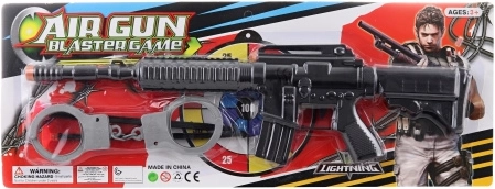 Szórakoztató műanyag készlet kis akcióhősöknek, amely tartalmaz egy 40 cm hosszú géppisztolyt, 2 tapadókorongos lövedéket és gyermekbilincset. Ideális a biztonságos és kreatív szerepjátékhoz rendőrösként vagy különleges egységként. Kártyás csomagolás, ajánlott 3 éves kortól.
