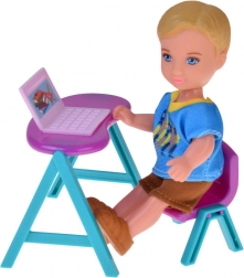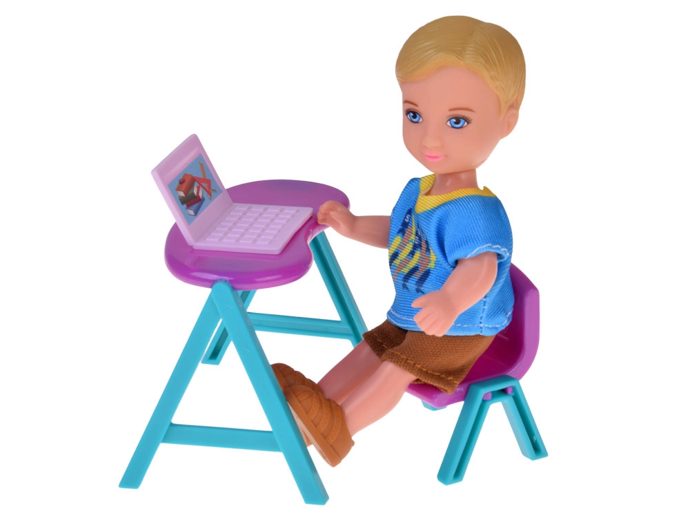 Pad székkel, tábla, vonalzók, számológép, abakusz és hátizsák támogatják az iskolás, rajzolós és számolós játékot. Ideális a fantázia és a türelem fejlesztéséhez.