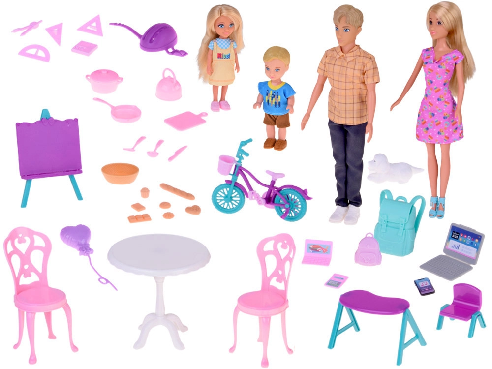 A játékjelenetek gördülékenyen váltakoznak otthon, iskola és munka között: főzzön finomságokat a konyhában, töltődjön fel az asztalnál, próbálja ki a tanulást a paddal és a laptoppal és a számológéppel, vagy élvezze a mozgást kint a biciklin sisakkal. A babák mozgatható végtagjainak és a színes kiegészítőknek köszönhetően a játék természetesen változatos és hosszan tartóan szórakoztató.