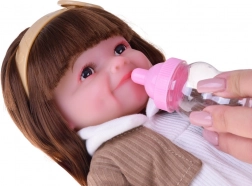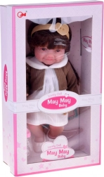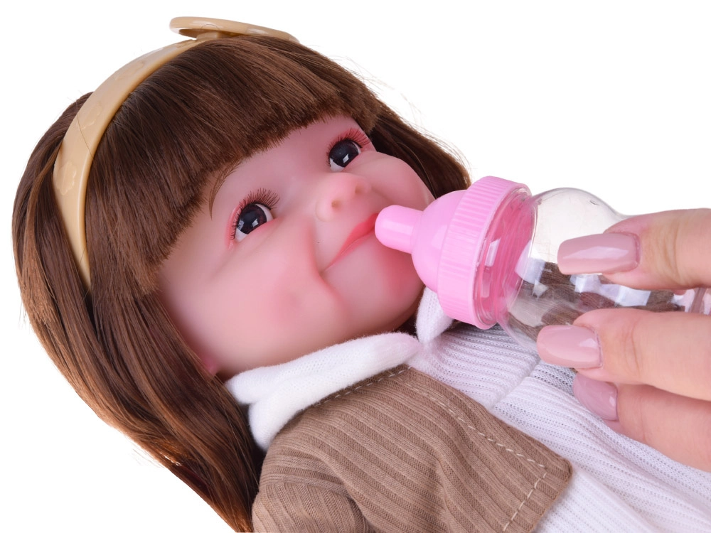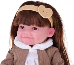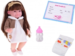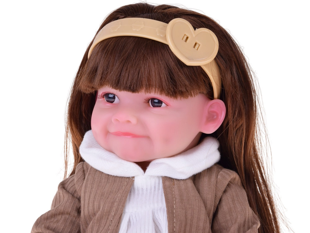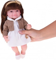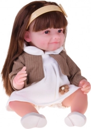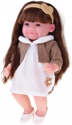 A Tosia baba finom mosollyal és hosszú barna hajjal minden gyermeket megörvendeztet. Puha, kellemes tapintású teste, mozgatható végtagjai vannak, és önállóan tud ülni. Tartozék a cumisüveg, a pelenka és a születési anyakönyvi kivonat a valósághű gondozós játékhoz. A stílusos öltözet fehér ruha, bézs kardigán, hajpánt és levehető balerina cipők.