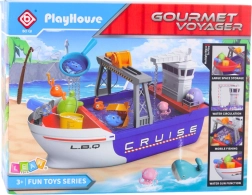 Ez a nagy és stabil gyerek hajó a fürdőbe és a játszószobába egyaránt valódi, élethű vízi játékélményt nyújt. A zárt vízkeringetés elektromos pumpával vizet takarít meg, és lehetővé teszi a folyamatos csapolást a poharakba és a „mosogatást”. A gyerekek mozgatható daruval, halacskák kifogásával és a kiegészítők kezelésével próbálhatják ki a kis horgász szerepét.