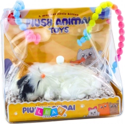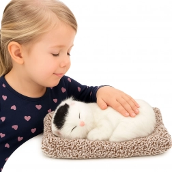 Az alvó fehér cica barna-fekete foltocskákkal hihetetlenül élethű, és azonnal meghitt hangulatot varázsol a térbe. A szőrt imitáló, puha felület simogatásra csábít, a finom nyávogó hangok pedig megnyugtató társsá teszik a gyerekek számára.
