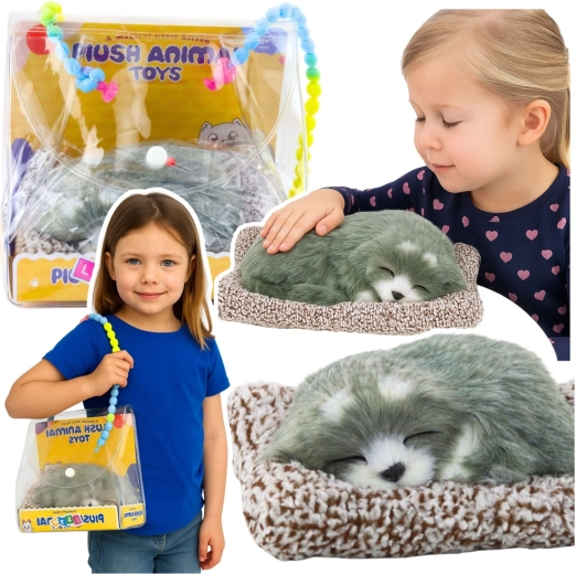 Élethű részletek és selymes szőrzet, mint egy valódi alvó kutyus – dísznek és ölelgethető társnak is tökéletes.