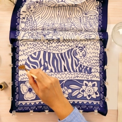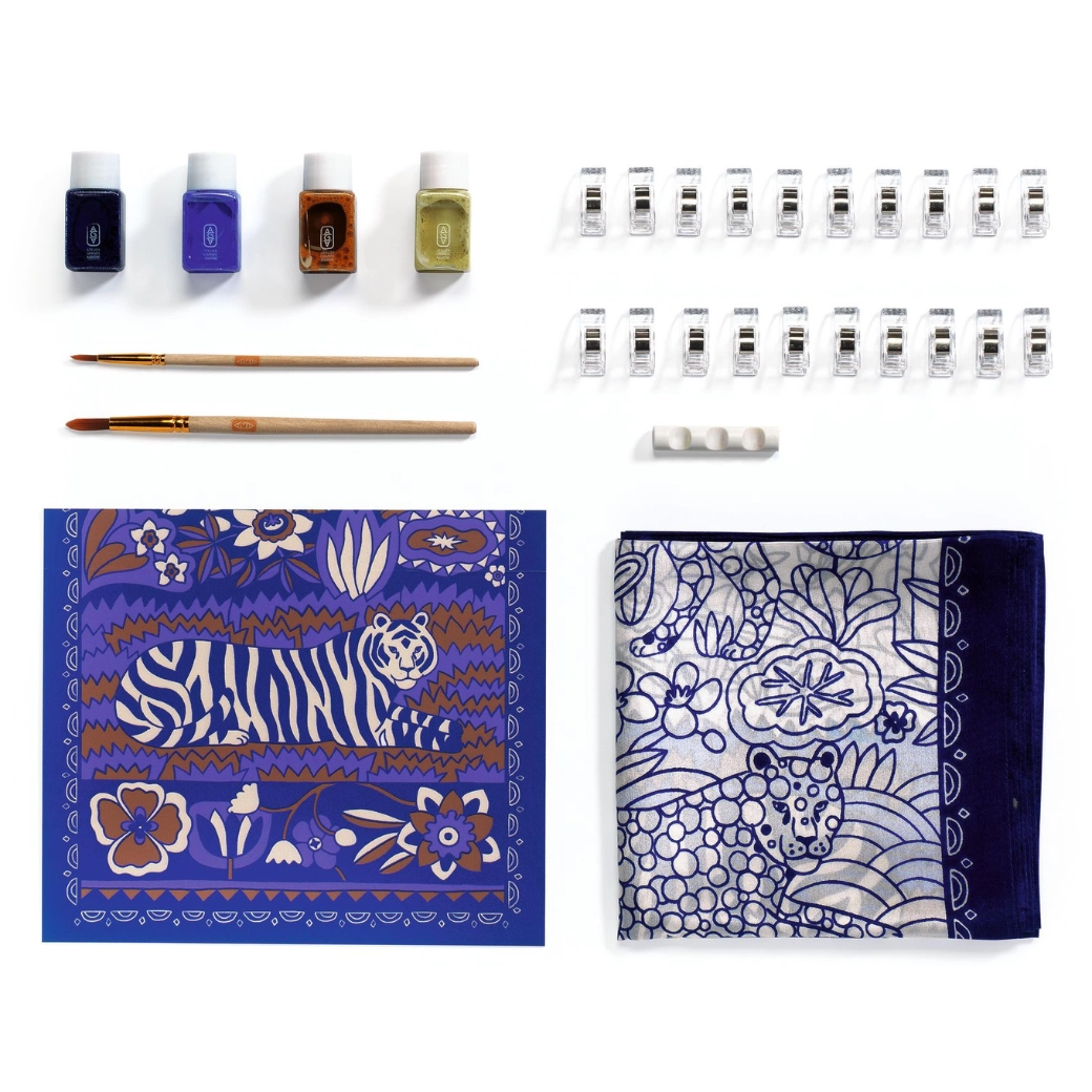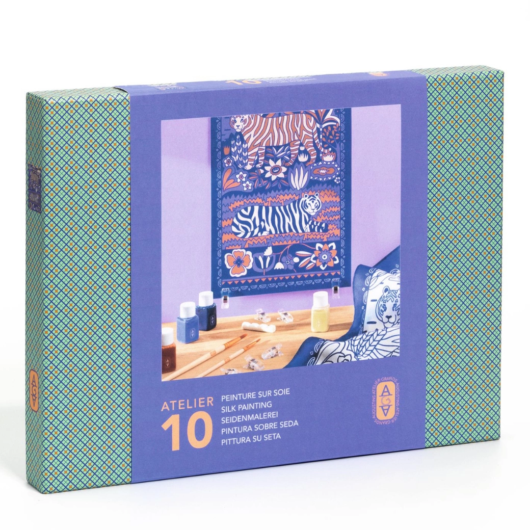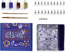 A DJECO Selyemfestés Atelier 10 készlet mindent tartalmaz, amire szüksége van egy gyönyörű, kézzel festett kendő elkészítéséhez. Az előrenyomott kontúrok tigris- és virágmintával vezetik az ecsetet és megkönnyítik a pontos színezést, ezért a projekt teljesen kezdők számára is megfelelő. A minőségi textilfestékekkel telt árnyalatokat és sima színátmeneteket érhet el.