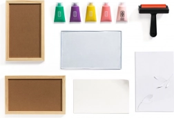 Praktikusan összeállított készlet géllemezzel, hengerrel, öt festékkel és papírokkal, hogy a kicsomagolás után azonnal alkothasson.