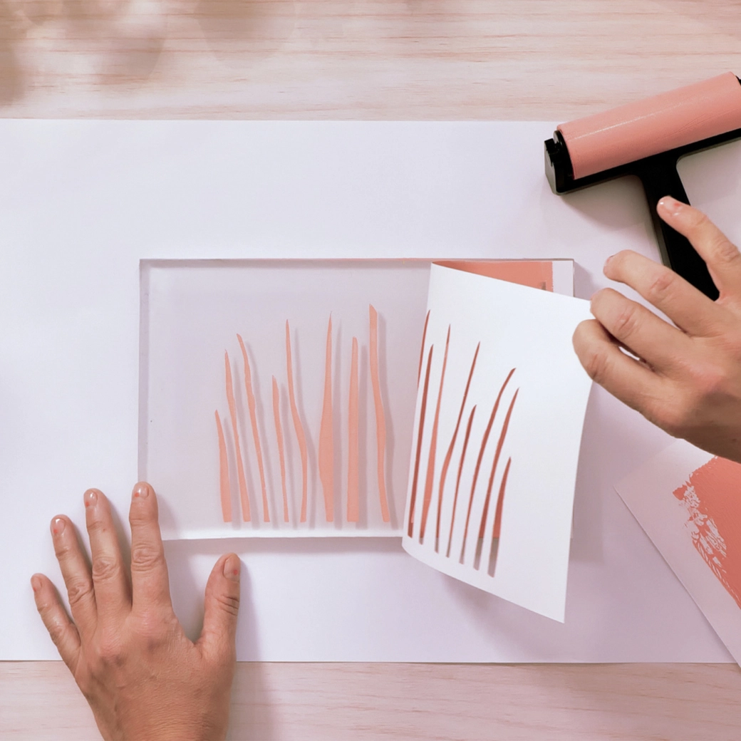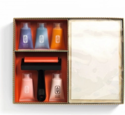 Minden, ami az első nyomathoz kell: géllemez, brayer, festékek, papírok és sablonok. Nyissa ki a dobozt és alkosson – további eszközök nélkül.