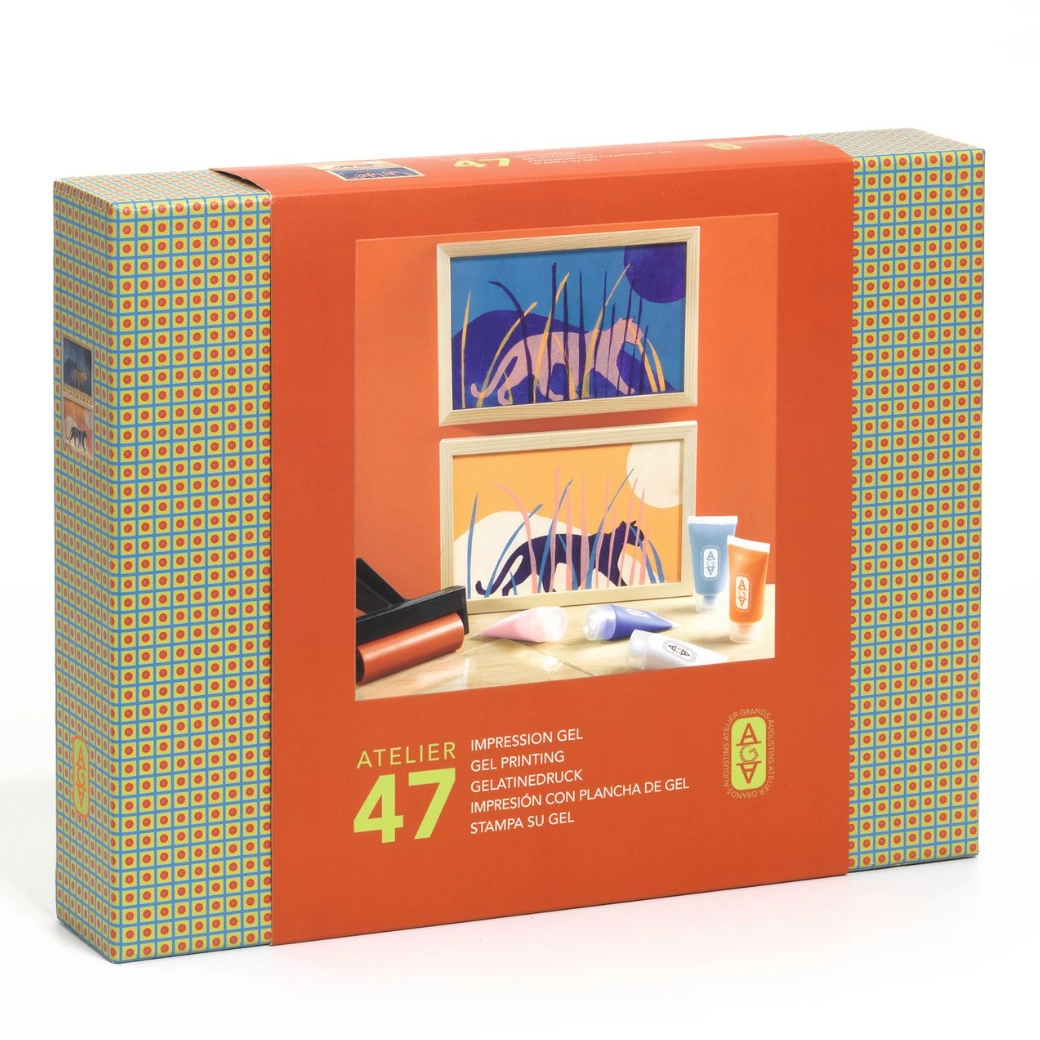 A DJECO Atelier gélnyomtató készlet elhozza az otthonába a népszerű gelli printing technikát. A transzparens géllemezre felviszi a festéket, brayerrel elhengerli, majd sablonok segítségével egyedi motívumokat alakít ki. Ezután csak papírt kell ráhelyezni és átnyomni – minden nyomat egyedi.