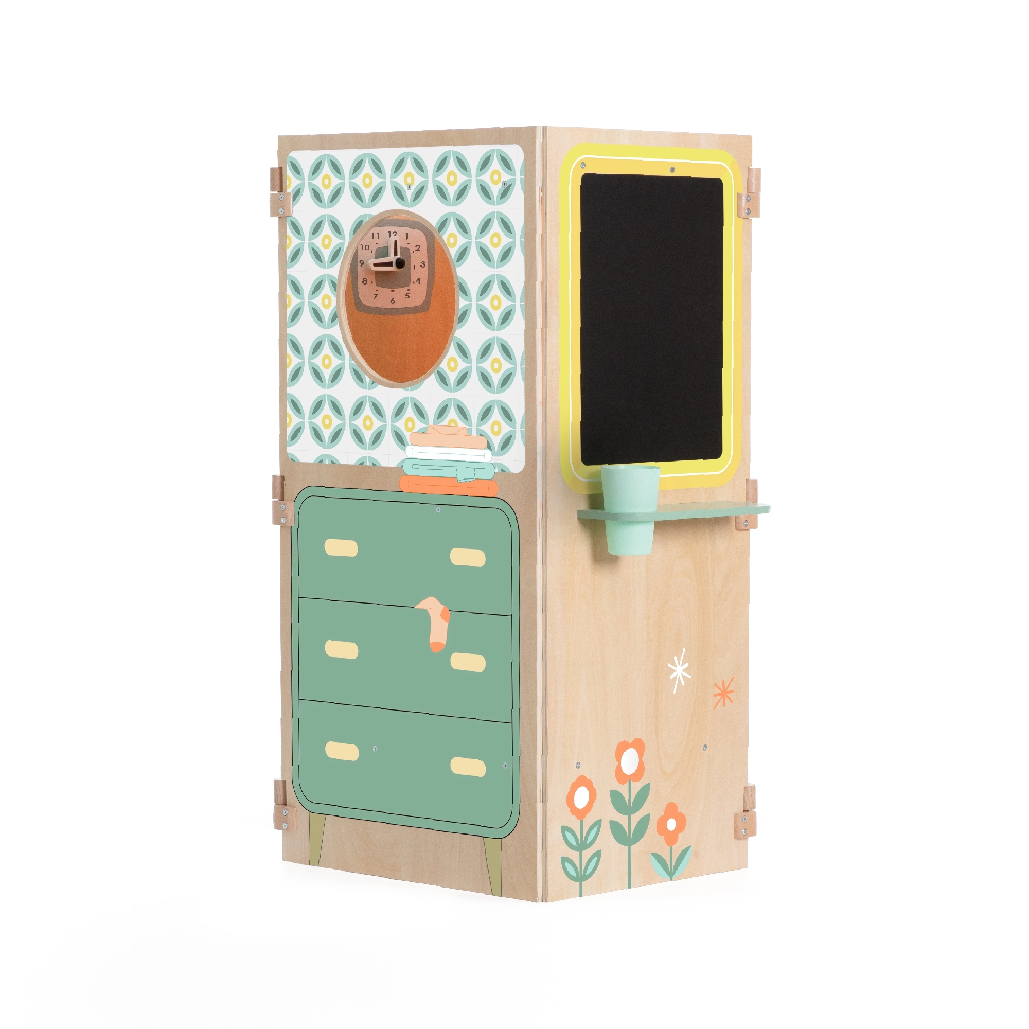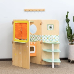 Ez a fa házikó végtelen fantáziajátékot kínál – a konyhai főzéstől és a mosókonyhai tevékenységektől kezdve egészen a kis színházi előadásig az ablaknál. Részét képezi egy praktikus tábla rajzoláshoz és feladatok írásához is. Masszív kivitelezése, minőségi anyagai garantálják a biztonságot és a hosszú élettartamot.
