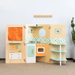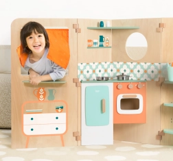 A házikó könnyen szétnyitható játékszegmensekre, és ugyanilyen egyszerűen kompakt formára csukható, így kisebb szobákba is ideális. A gazdag tartozékkészlet (lábasok, csészék, evőeszközök, só és bors) támogatja a szerepjátékot, a társas interakciókat és a készségek fejlesztését.