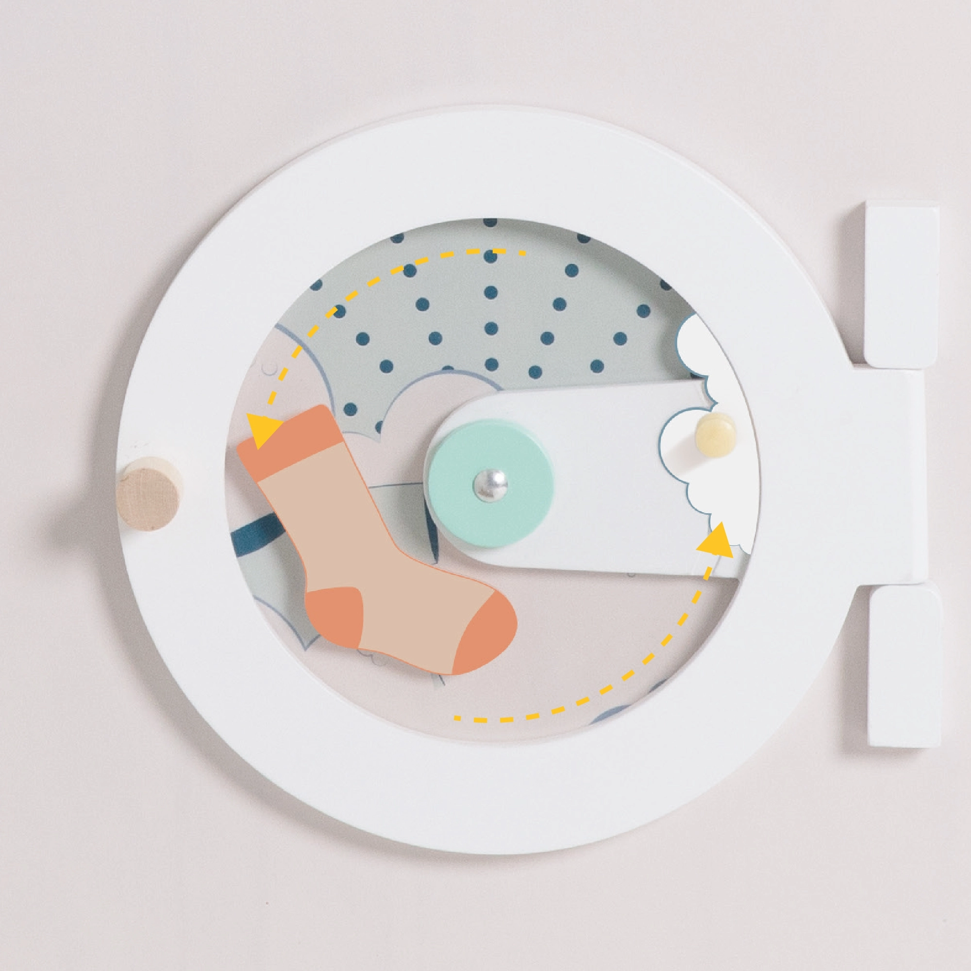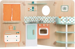 Beépített „mosógép” kerek ablakkal és kezelőszervekkel, amely bővíti a játék témáit – a mosástól a szennyes válogatásán át a háztartás gondozásáig.