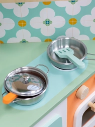 A gyerekek „főzhetnek”, süthetnek és kiszolgálhatnak az ablaknál. A nyitható ajtók, forgatható gombok és polcok támogatják a valósághű játékot és a kellékek rendszerezését.