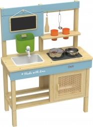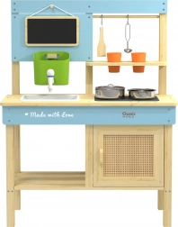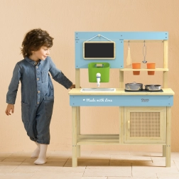 Ez a minőségi gyerekkonyha tanúsított, természetes fából készült, és éles élek nélkül lett tervezve a 3 éves kortól biztonságos játékért. Tartós kivitelének és okos elrendezésének köszönhetően az akasztókkal és polcokkal a gyerekek könnyen elrámolják az edényeket és eszközöket. A kis tábla szolgálhat menüként vagy feladatlistaként – csak egy kis kréta kell, és a fantázia beindul teljes gázzal.